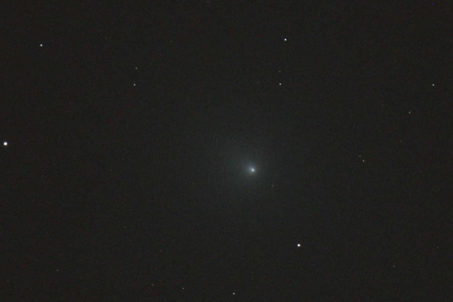 In der Nacht von Mittwoch auf Donnerstag wurden mit 15 klare wolkenlose Minuten beschert und ich konnte den Kometen endlich mehrmals ablichten. 18 Bilder zu je 30 Sekunden genügten, um seine Eigenbewegung deutlich zu zeigen. Seine stündliche Bewegung lag bei etwa 600 Winkelsekunden pro Stunde. Die Animation zeigt hier den Zeitraum von zehn Minuten und seine Entfernung zur Erde war 0,08 AE.