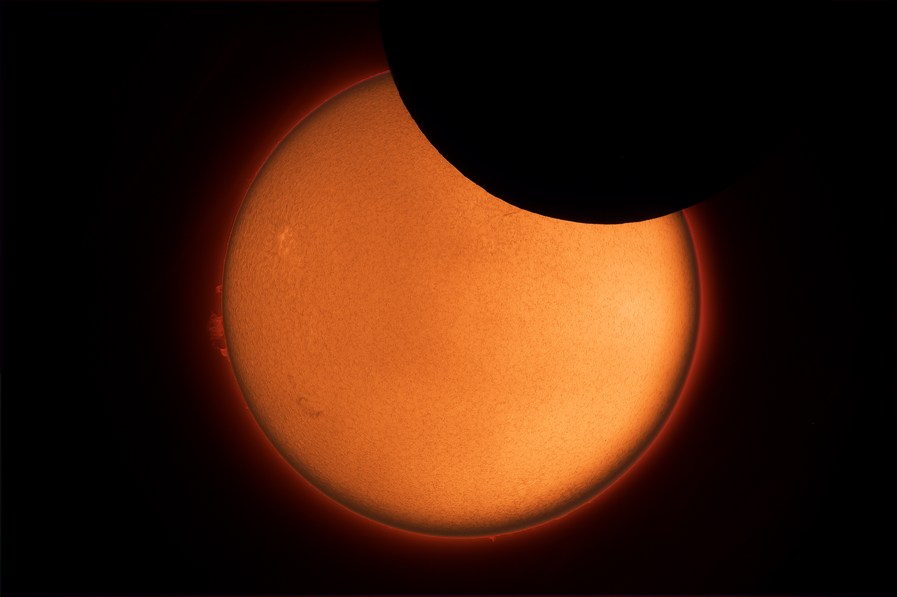 Gestern konnte ich die partielle Sonnenfinsternis über Bremervörde ablichten. Das Bild entstand um 13:18 Uhr, kurz vor dem Maximum der Abdeckung (danach zogen Wolken auf). Belichtet wurde mit der Canon Ra am 80mm APO bei f/25 und einer Brennweite von F=2m. Als H-Alpha-Filter kam der Daystar Quark Chromosphere zum Einsatz. Überlagerung von zwei Belichtungen: 1/30sec bei ISO 400 für die Oberflächendetails und 1/30sec bei ISO 12800 für die Protuberanzen am Sonnenrand.