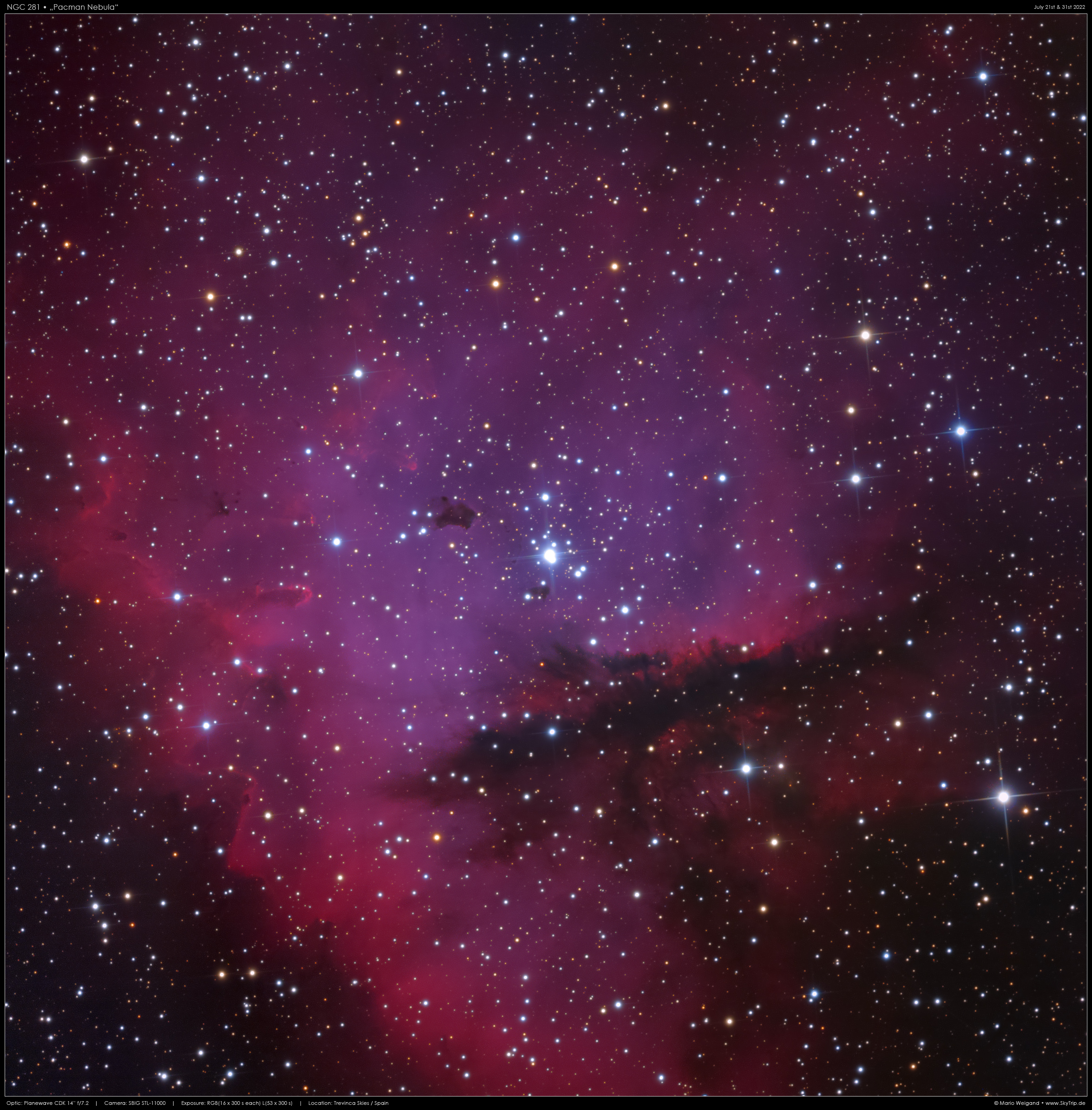 Im Sternbild Kassiopeia findet man ungefär 1,75 Grad westlich von Schedar die 30 bis 35 Bogenminuten große HII-Region. In ihr entstehen Sterne, woraus sich bereits ein Sternhaufen gebildet hat, der mit IC 1590 bezeichnet wird. Das hellste Mitglied von IC 1590, das Mehrfachsternsystem BD +55° 191 (HD 5005), ist die ionisierende Quelle des Nebels. Der Nebel steh in etwa 9500 Lichtjahren Entfernung. Ein sehr interessantes »Feature« des Nebels sind mehrere schöne Bok-Globulen, in denen durch Infrarotaufnahmen Anzeichen für Sternentstehung festgestellt werden konnten. Einige davon sind auch auf der Aufnahme zu erkennen. Die Aufnahme entstand in drei Nächten mit einem Remote-Teleskop in Spanien. Insgesamt wurden rund 8,4 Stunden mit der SBIG STL-11000M am Planewave CDK 14" belichtet. http://www.skytrip.de