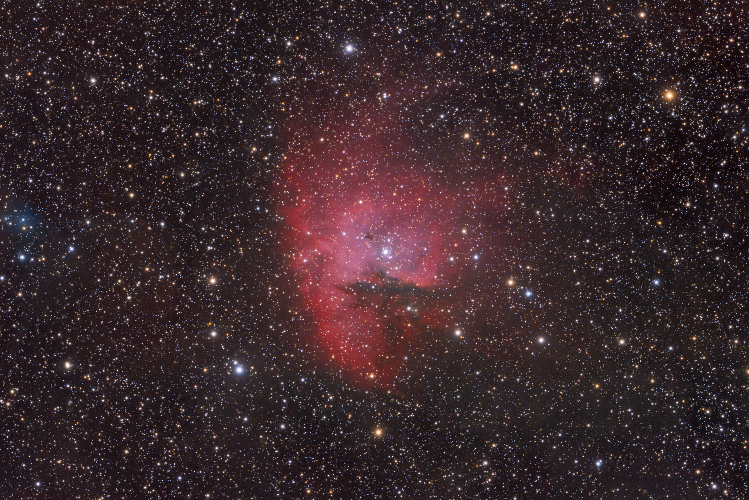 Meine erste tiefe Aufnahme dieses Nebelkomplexes in der Kassiopeia. Über mehrere Nächte belichtete ich insgesamt zehn Stunden lang, um die schwachen Nebelfetzen abzubilden, in die der bekannte Pacman-Nebel eingebettet ist. Bei der Bearbeitung fiel mir der blaue Reflexionsnebel am linken Bildrand auf, der nicht oft abgebildet wird.