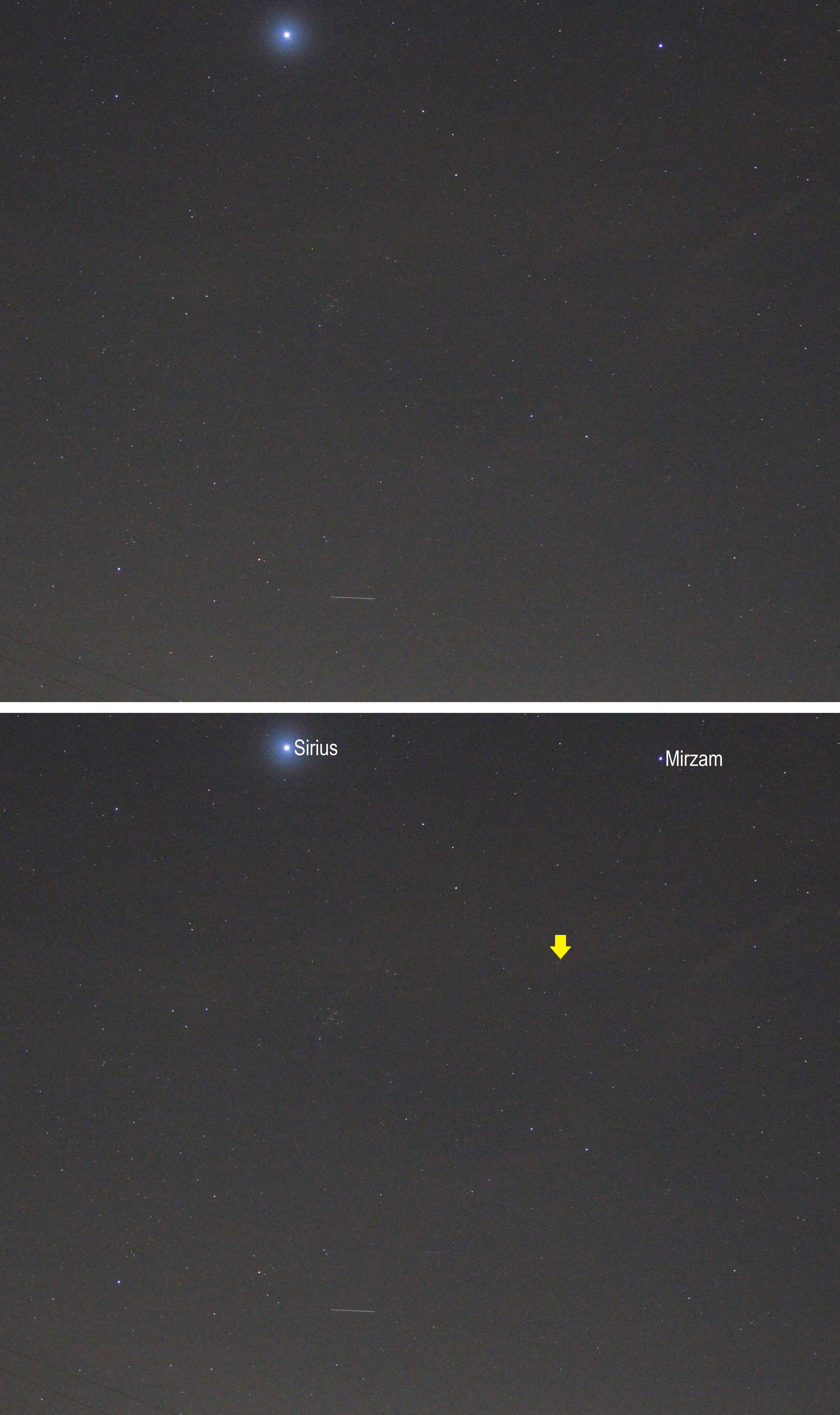 Nördliche Gebiete des Sternbilds Großer Hund, in dem sich zur Zeit der Kleinplanet Pallas aufhält. Auf dem unteren Bild, das zur gleichen Zeit mit den gleichen Belichtungsparametern wie das obere Bild aufgenommen wurde und das auch den gleichen Himmelsausschnitt zeigt, ist der Asteroid Pallas mit einem gelben Pfeil markiert.