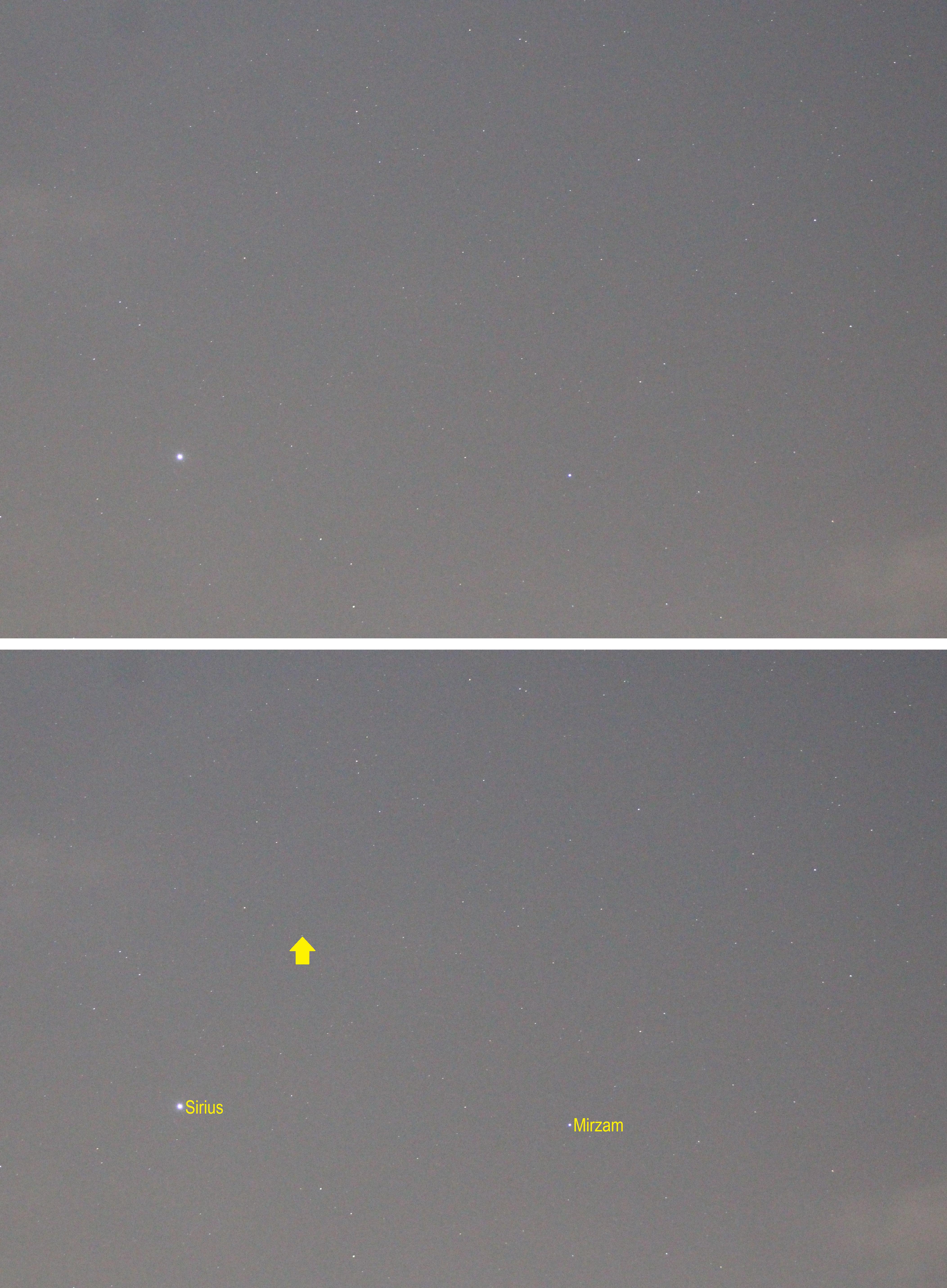 Nördliche Gebiete des Sternbilds Großer Hund, in dem sich zur Zeit der Kleinplanet Pallas aufhält. Auf dem unteren Bild, das zur gleichen Zeit mit den gleichen Belichtungsparametern wie das obere Bild aufgenommen wurde und das auch den gleichen Himmelsausschnitt zeigt, ist der Asteroid Pallas mit einem gelben Pfeil markiert.