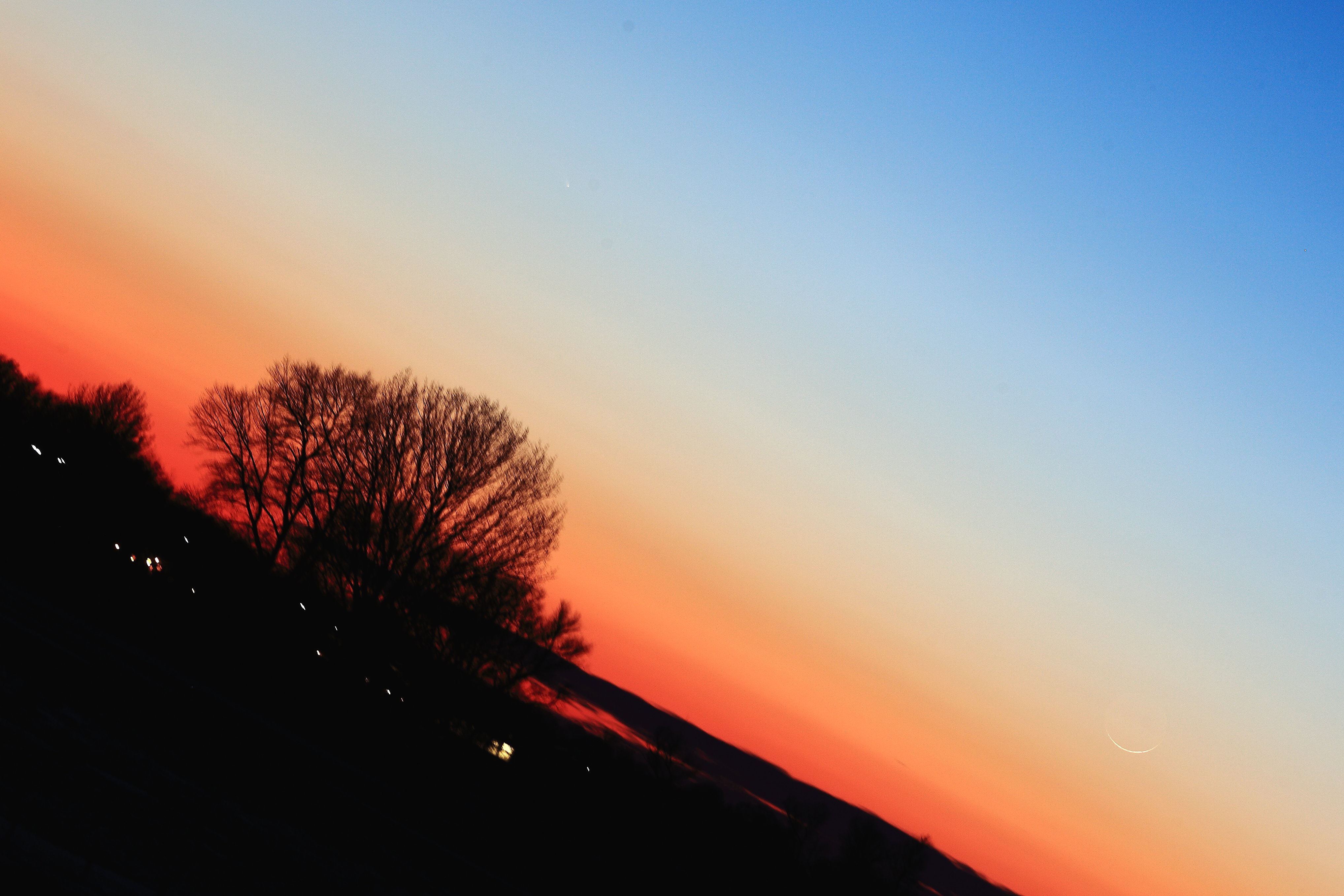 Die Kamera lief Piggyback auf dem Sternwartengerät. Da es zu dieser Zeit noch sehr hell war, konnten wir den Kometen nur mit dem Fernglas entdecken. Zu ihm gesellte sich die erst einen Tag alte Mondsichel (1%).