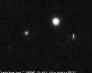 Es war ein Versuch, den Quasar J014709+46303 im Sternbild Andromeda zu fotografieren. Er liegt nahe dem hellen Stern TYC3279-1686-1. Und er ist eine echte Herausforderung für uns Amateur-Astrofotografen, weil sein Schirm nur etwa drei Bogensekunden hoch ist! In der Volkssternwarte Meckesheim haben wir ihn uns mit einem Meade 14 Zoll als abendliches Ziel vorgenommen. Der Himmel war zwischen Wolkenlücken ab und zu klar. Das Seeing sollte unter einer Bogensekunde liegen, allerdings waren die Jetstreams mit 40 bis 50 m/s schneller als gewünscht und führten zu erheblichen Bewegungen im Foto. Aus einem Satz von 2300 Fotos á 500 ms Belichtung konnten händisch 24 Fotos selektiert werden, die den Quasar oder Teile davon eindeutig im Rauschen des Fotos zeigen. Nach dem Stacking in Fitswork ist der Fallschirm klar zu erkennen, selbst das vierte Abbild des Quasars ist schwach zu sehen. Der Schirm ist etwa 15 Pixel hoch, jedes Abbild des Quasars maximal drei Pixel groß. Die Bilder zeigen, dass es prinzipiell auch als Amateur möglich ist, mit überschaubarem Aufwand solche herausfordernden Objekte zu fotografieren.