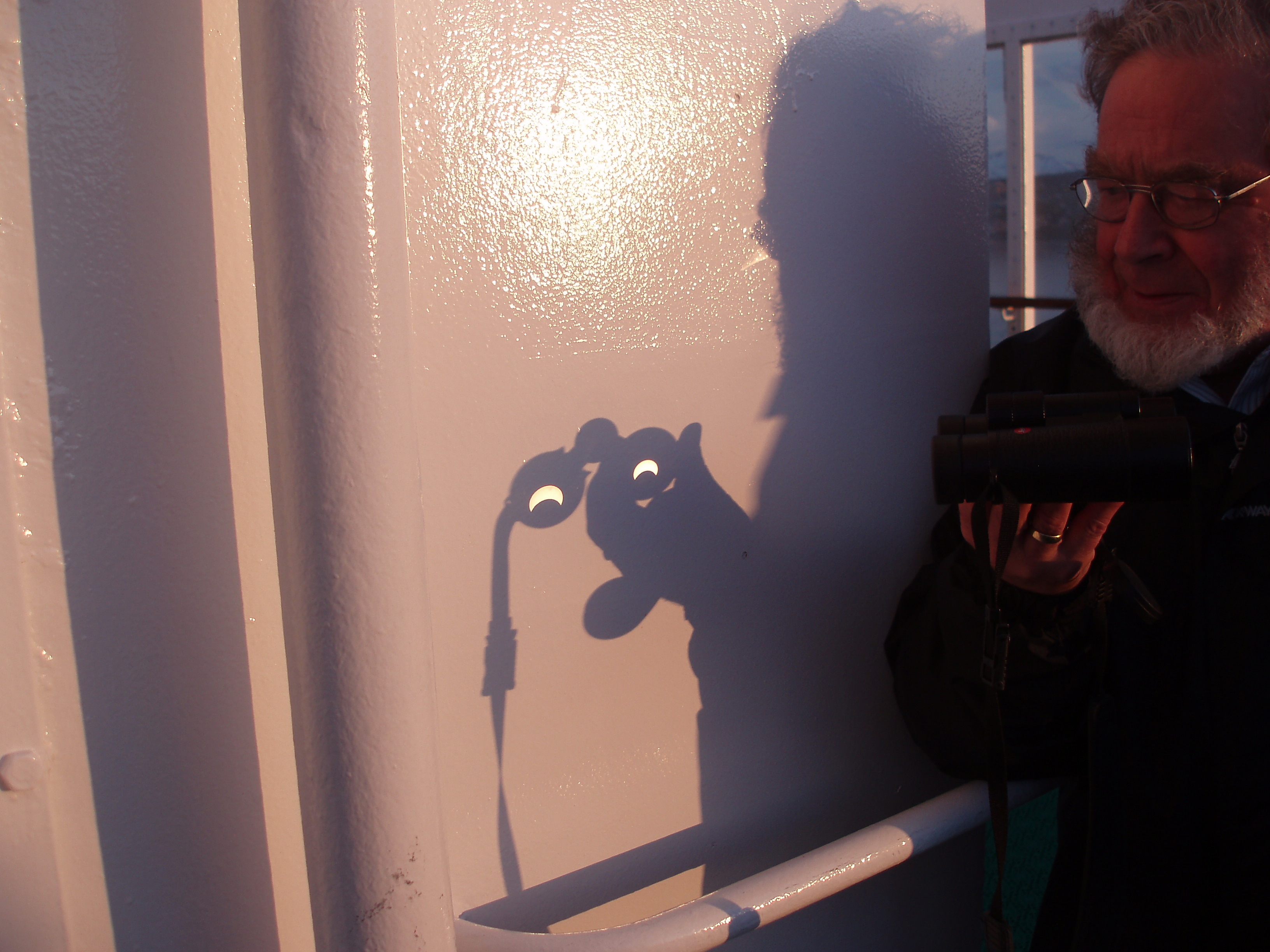 Am 1. Juni 2011 näherten wir uns kurz vor Mitternacht auf dem Hurtigrutenschiff Nordnorge dem Hafen von Tromsö. Ich projizierte die partiell verfinsterte Sonne auf eine Schiffswand und meine Frau machte das Foto. Andere Passagiere waren erstaunt, wie leicht und gefahrlos man die partiell verfinsterte Sonne demonstrieren kann und machten mit ihren Ferngläsern dasselbe.