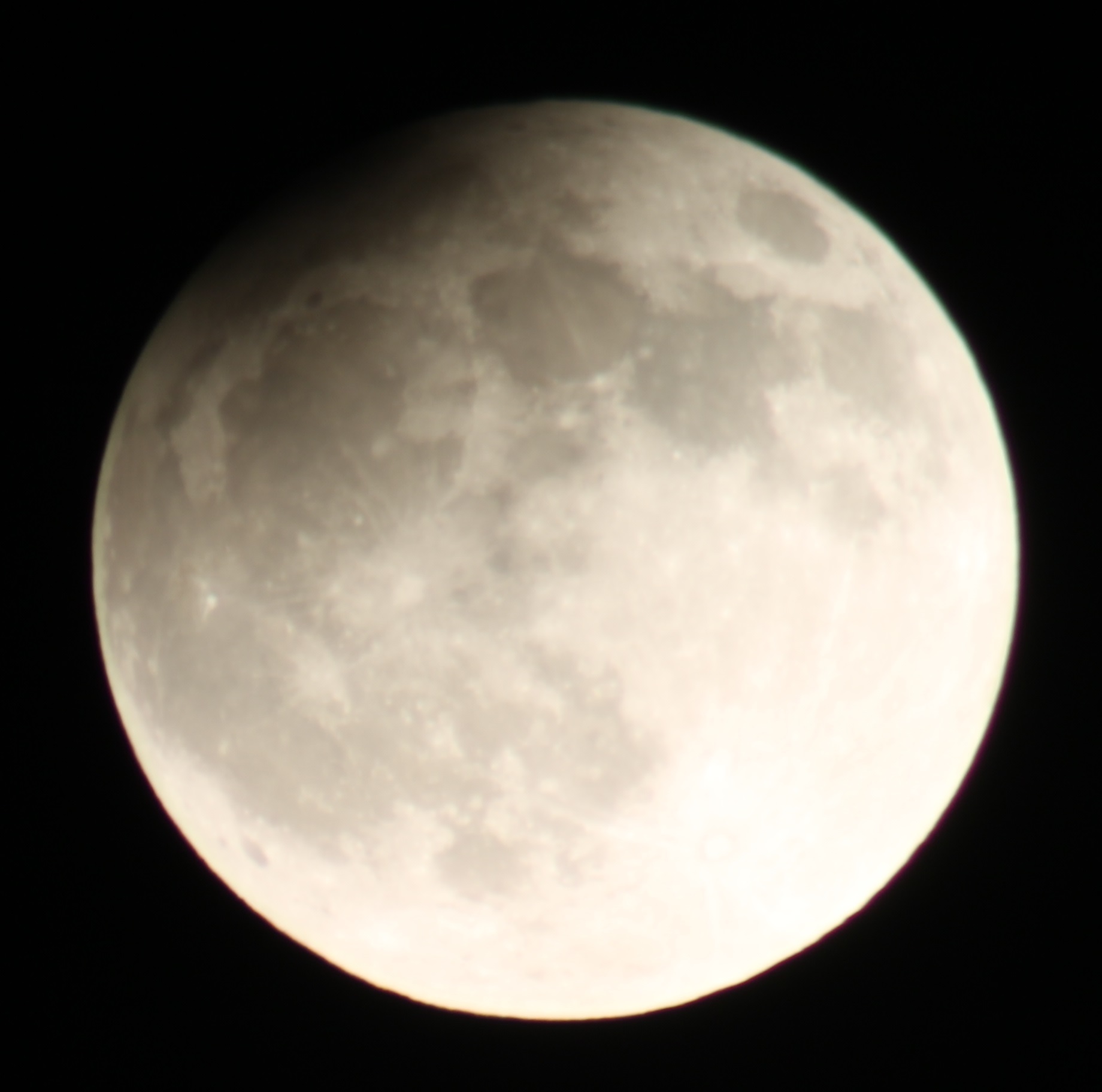 Zum Zeitpunkt der größten Phase sah man, dass der Mond links oben etwas "angeknabbert" war. Dieses Erscheinungsbild wurde auf dem folgenden Foto wiedergegeben. Natürlich sind die Partien des Mondes rechts unten überbelichtet.