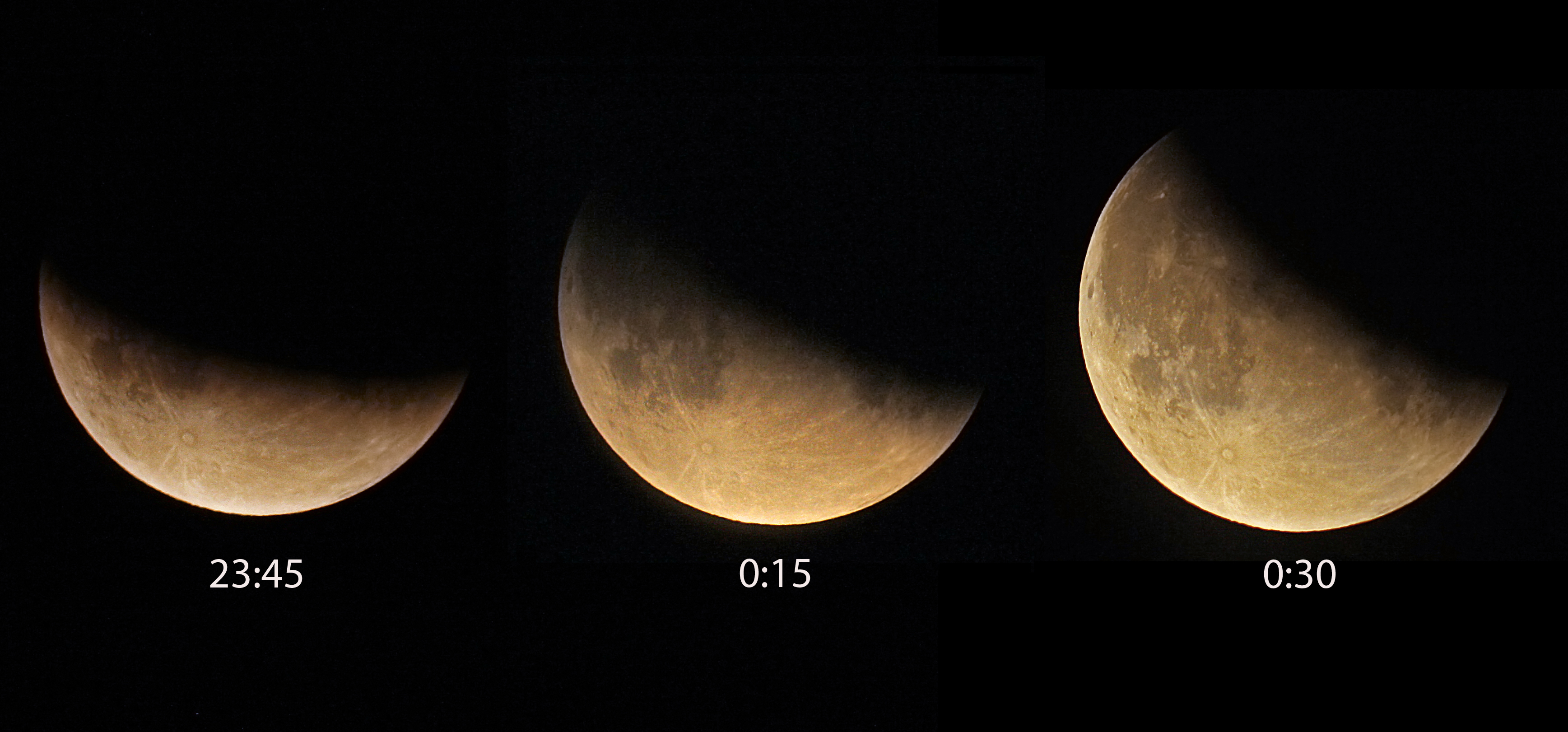 Zu Beginn der Finsternis war der Mond bei uns in Norddeutschland noch teilweise von Wolken umhüllt. Später klarte es dann auf, sodass diese Fotos bis fast zum Austritt aus dem Kernschatten aufgenommen werden konnten.