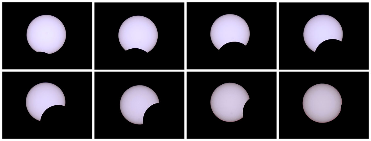 Bilderserie aus 8 Einzelbildern, insgesamt entstanden mehrere Dutzend Fotos während der partiellen Finsternis. Aufgenommen mit einer Filterfolie vor dem Objektiv, die mir ein lieber Freund aus Deutschland gerade noch rechtzeitig zugeschickt hatte.