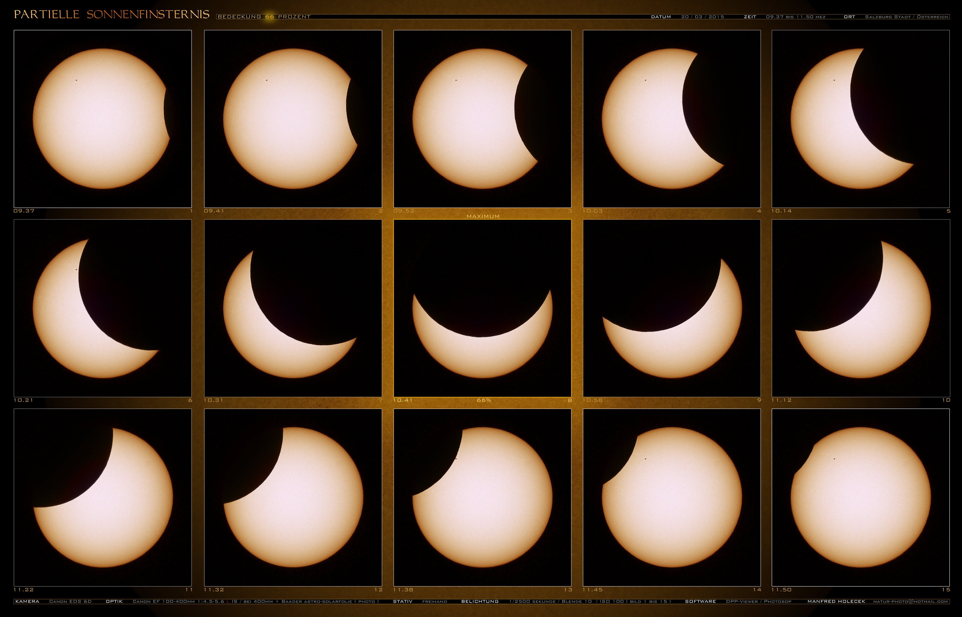 Um den kompletten Verlauf dieser Sonnenfinsternis fotografisch dokumentieren zu können, musste ich diesmal während der Arbeit alle paar Minuten ins Freie. Deswegen konnte ich keine regelmäßigen Abstände zwischen den Aufnahmen realisieren. Einige Arbeitskollegen und Kunden interessierten sich sehr dafür, was und wie ich da fotografierte, und sie nutzten auch dankend mein Fernglas mit Sonnenfilter.