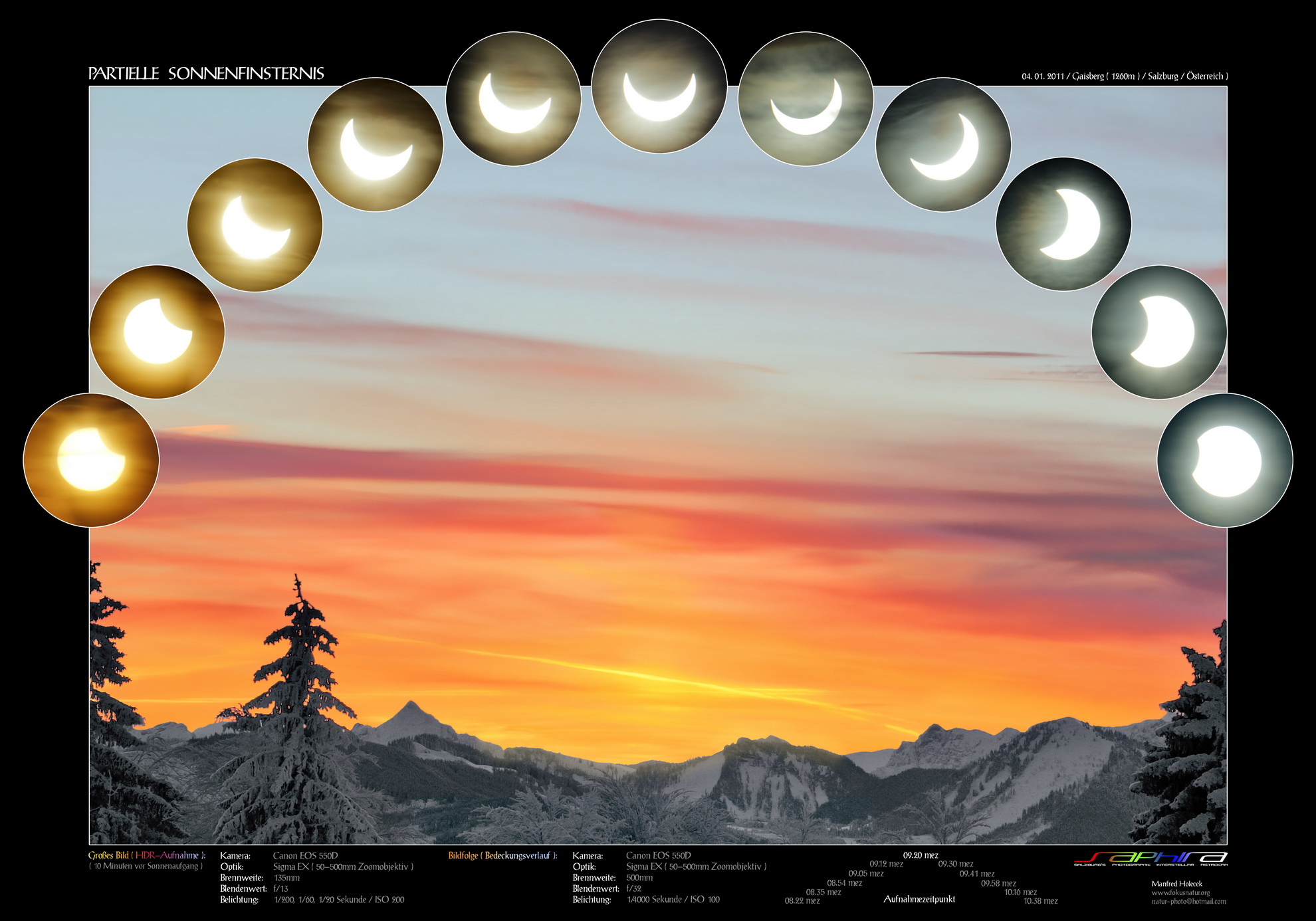 Entgegen aller Annahmen war das Wetter frühmorgens am 4.1.2011 in Salzburg ausreichend schön, um die partielle Sonnenfinsternis fotografisch verfolgen zu können. Mein erklärtes Ziel, nur recht einfaches Equipment zum Einsatz zu bringen, ging auf, denn so konnte ich die beeindruckende
