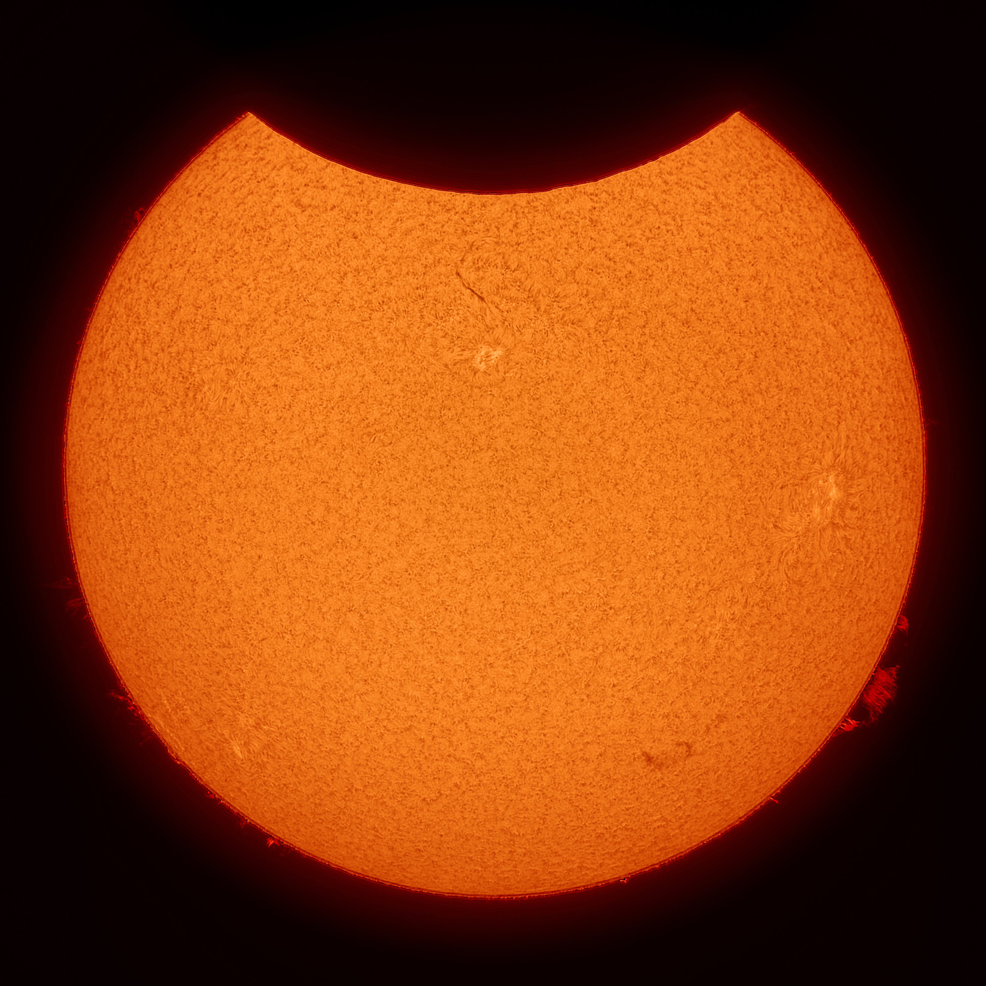 Das vorliegende Bild zeigt die partielle Sonnenfinsternis im H-Alpha-Licht. Auch Protuberanzen sind sichtbar. Die Aufnahme konnte ich während meiner Mittagspause direkt von meinem Balkon aus anfertigen. Anschließend blieb sogar noch etwas Zeit für visuelle Beobachtung.