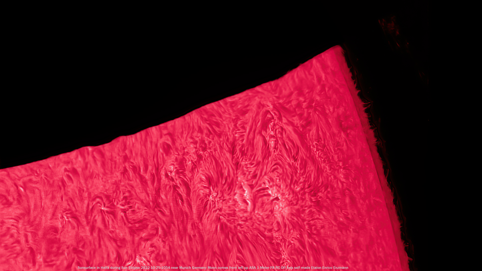 Dabei wird der Vollmondrand mit seinen Bergen und Tälern sichtbar. Auch sind in der Chromosphäre gut die so genannten Spikulen, die typischerweise um die 4500 Kilometer Höhe erreichen, schön zu sehen. Im Bild sichtbar ist auch die feine Trennlinie die nur zirka 400 bis 600 Kilometer dick ist und sich nur sehr selten so gut zeigt. Bei genauem Hinsehen erkennt man auch eine freischwebende Protuberanz "auf 3 Uhr".