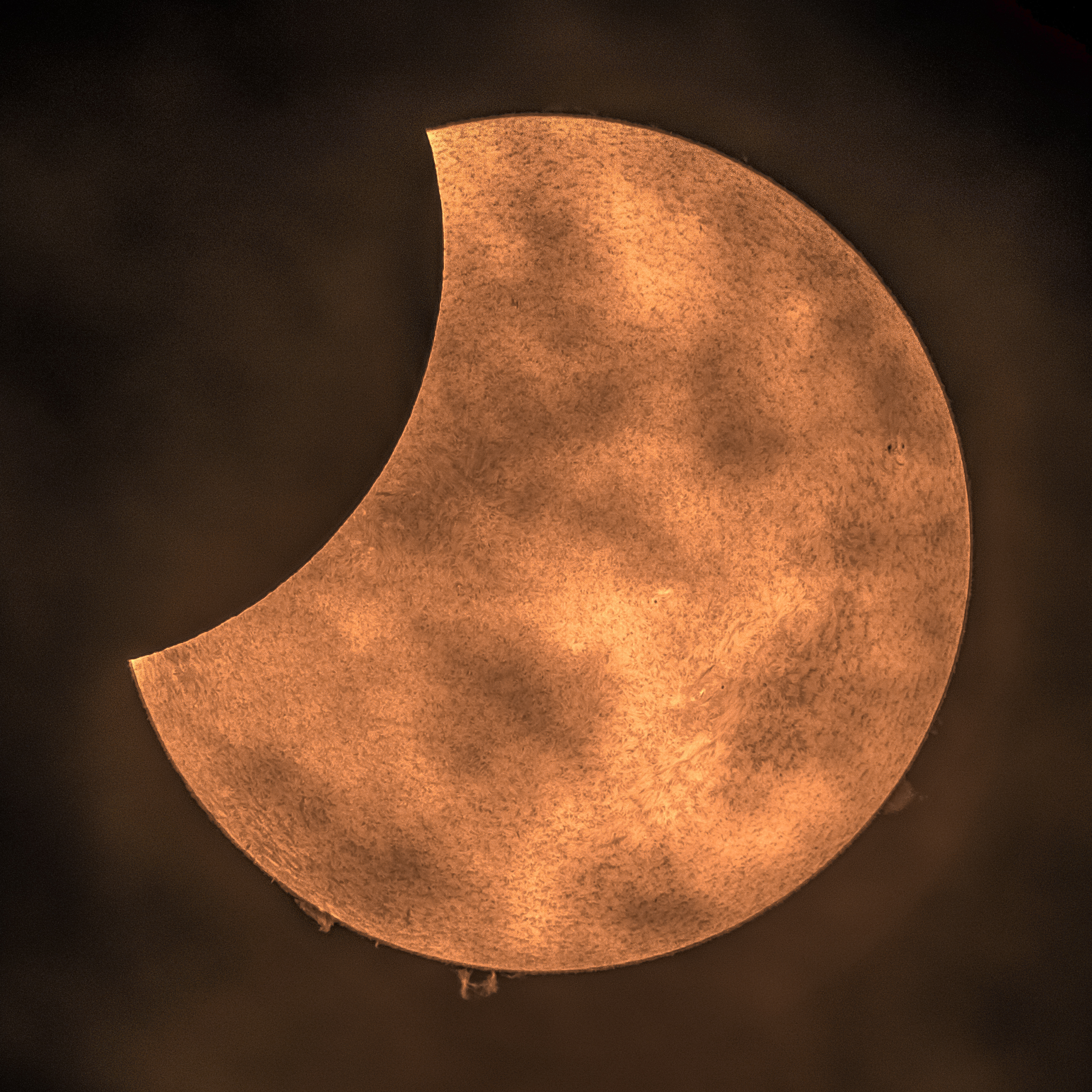 Das vorliegende Bild zeigt die partielle Sonnenfinsternis im H-Alpha-Licht. Es handelt sich um eine kolorierte Einzelbelichtung mit 50 Millisekunden Belichtungszeit aus einer Monochromkamera. Die Bedingungen waren nicht optimal: Ich musste durch eine Wolkenschicht hindurchfotografieren. Dennoch sind Protuberanzen sichtbar. Eine Gruppe aus Sonnenflecken mittig-rechts erweckt den Eindruck eines lachenden Gesichts. Die Aufnahme konnte ich während meiner Mittagspause direkt von meinem Balkon aus anfertigen.
