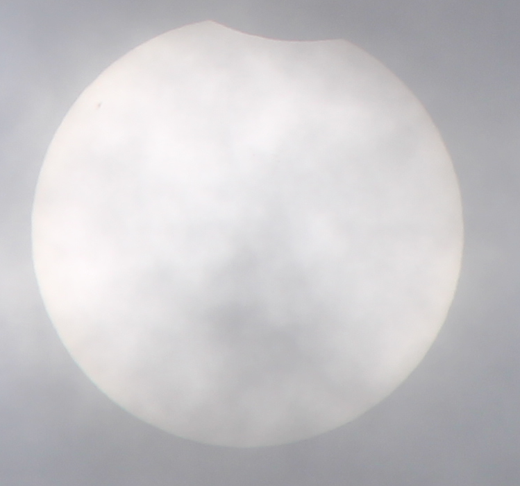 Obwohl an meinem Beobachtungsort die Wolkendecke geschlossen war, konnte ich durch Wolkenlücken einige Bilder der partiellen Sonnenfinsternis am 29. März 2025 machen. Dieses Bild zeigt die Sonne durch eine Wolkenlücke kurz vor dem Ende der Finsternis