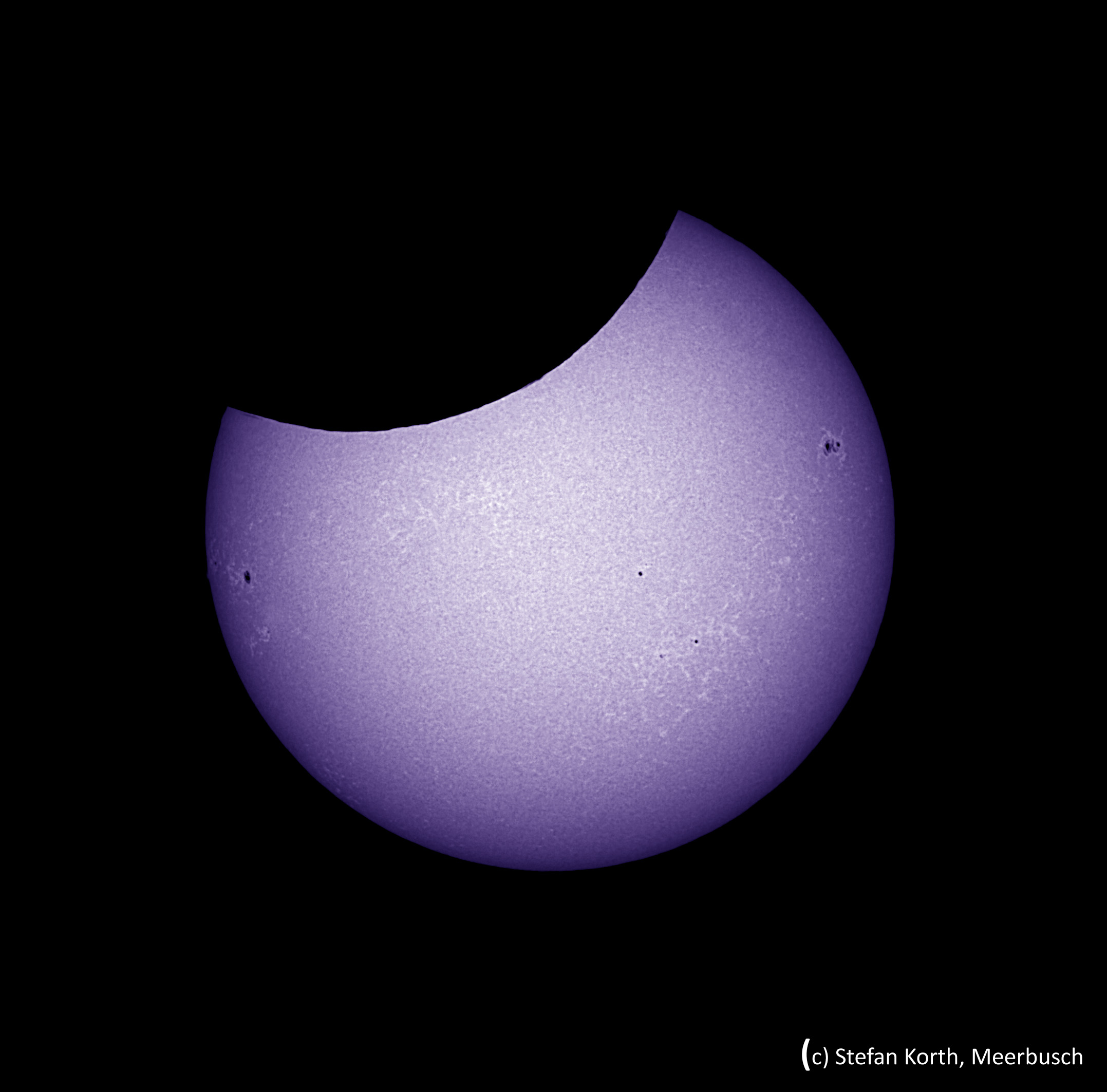 Bei der partiellen Sonnenfinsternis am 25. Oktober 2022 hatte ich Glück - trotz einzelner durchziehender Wolken konnte ich von meinem Meerbuscher Garten den gesamten Verlauf verfolgen. Einmal mehr habe ich da meinen apochromatischen 60 mm - Refraktor mit 360 mm - Brennweite und CaK-Herschel-Keil verwendet. Der Vorteil des Spektralbereichs von 393 nm: Das Sonnenbild ist sehr kontrastreich sowohl auf Flecken als auch auf Fackeln bezogen, durch die stärkere Randverdunkelung entsteht auch ein sehr plastischer Eindruck der Sonnen-"Kugel".