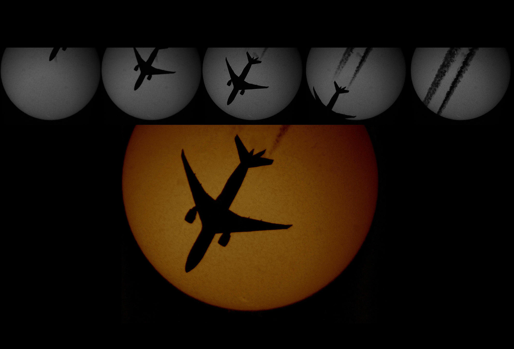 Ein schnelle partielle Sonnenfinsternis verursachte ein Verkehrsflugzeug in meinem Sonnenteleskop. Ich hatte gerade eine Aufnahmeserie gestartet, als sich der Computermonitor kurzfristig verdunkelte. Das Flugzeug hatte ich anfangs noch gar nicht gesehen. Dafür blieben aber die Kondensstreifen des zweimotorigen Verkehrsflugzeuges noch eine ganz Weile im Bild und mir war klar, dass auch der Verursacher auf den Aufnahmen zu finden sein müsste