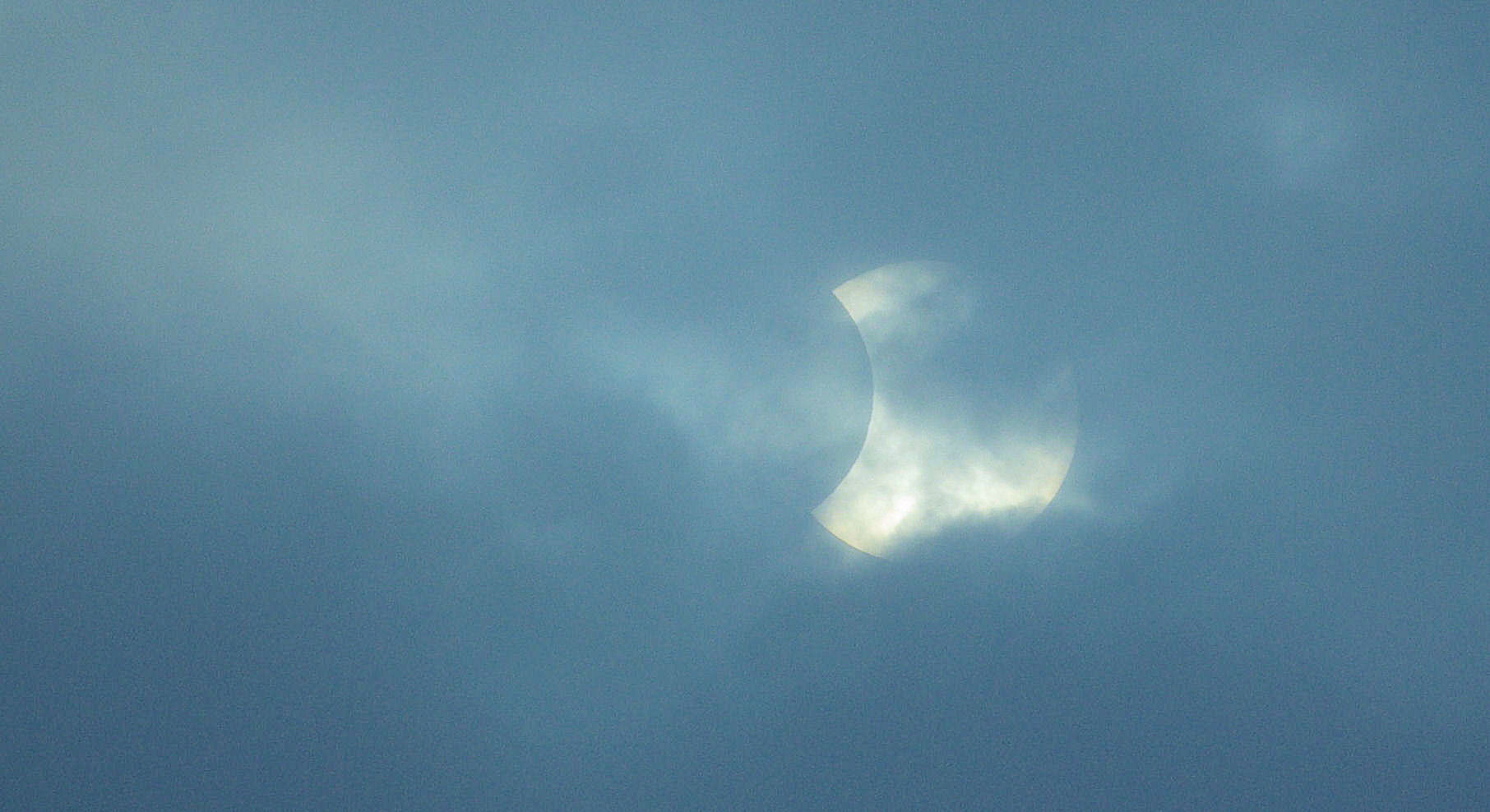 Die partielle Sonnenfinsternis am Morgen des 4.Januar 2011 war vom Eichsfeld aus nur sehr schwer zu beobachten. Der Anfang der Finsternis, der Aufgang der schon verfinsterten Sonne, bis hin zum Maximum der Bedeckung gegen 9:20 Uhr waren wegen der dichten Wolkendecke gar nicht zu sehen. Erst kurz vor 10:00 Uhr machten ein paar kleine Auflockerungen in der Wolkendecke Hoffnung auf einen kurzen Blick auf die teilweise durch den Mond verfinsterte Sonne. Und tatsächlich, für wenige, winzige Augenblicke gaben einzelne Wolkenlücken den Blick frei, so daß dieses Foto entstehen konnte.