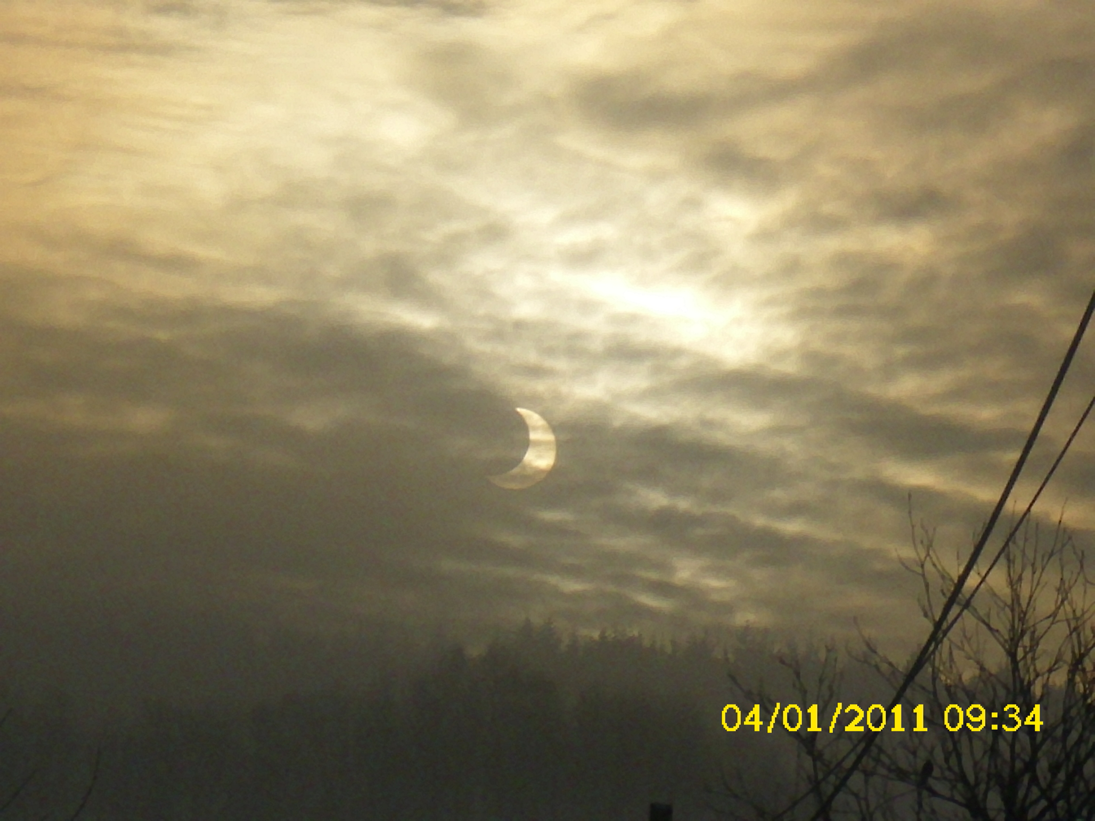 Florian Glünz fotografierte das Maximum von 76 % Verdeckung des Mondes am 4.1.2011 über Mayen. Die Bewölkung war stark, so dass die Sonnensichel gut zu sehen ist.