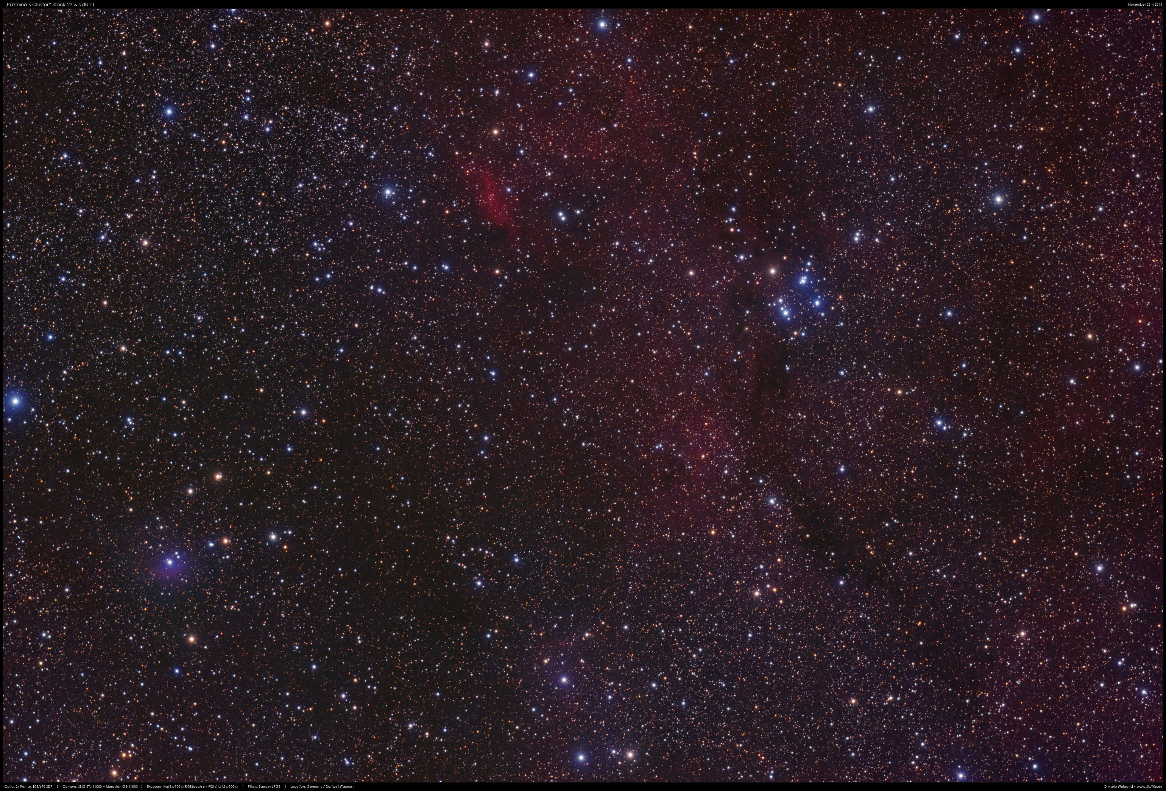 Stock 23, aufgrund eines Artikel in Sky&Telescope auch bekannt als „Pazmino's cluster“, ist ein kompakter Sternhaufen im Sternbild Camelopardalis (Giraffe) und ein schönes Ziel für die visuelle Beobachtung. Sein Erscheinungsbild wird von einer trapezförmigen Anordnung 7 bis 8 mag heller Sterne dominiert. Stock 23 befindet sich in einer Region voller Dunkelwolken und Gasnebeln, die auf dieser Aufnahme hervortreten. Direkt am Sternhaufen vorbei verlaufen die Dunkelwolken LDN 1377 bis 1384. Das großräumige diffuse rote Leuchten stammt von Sh2-202; der kompaktere Emissionsnebel links von Stock 23 ist LBN 676. Unten links im Bild sieht man den Reflexionsnebel vdB 11.