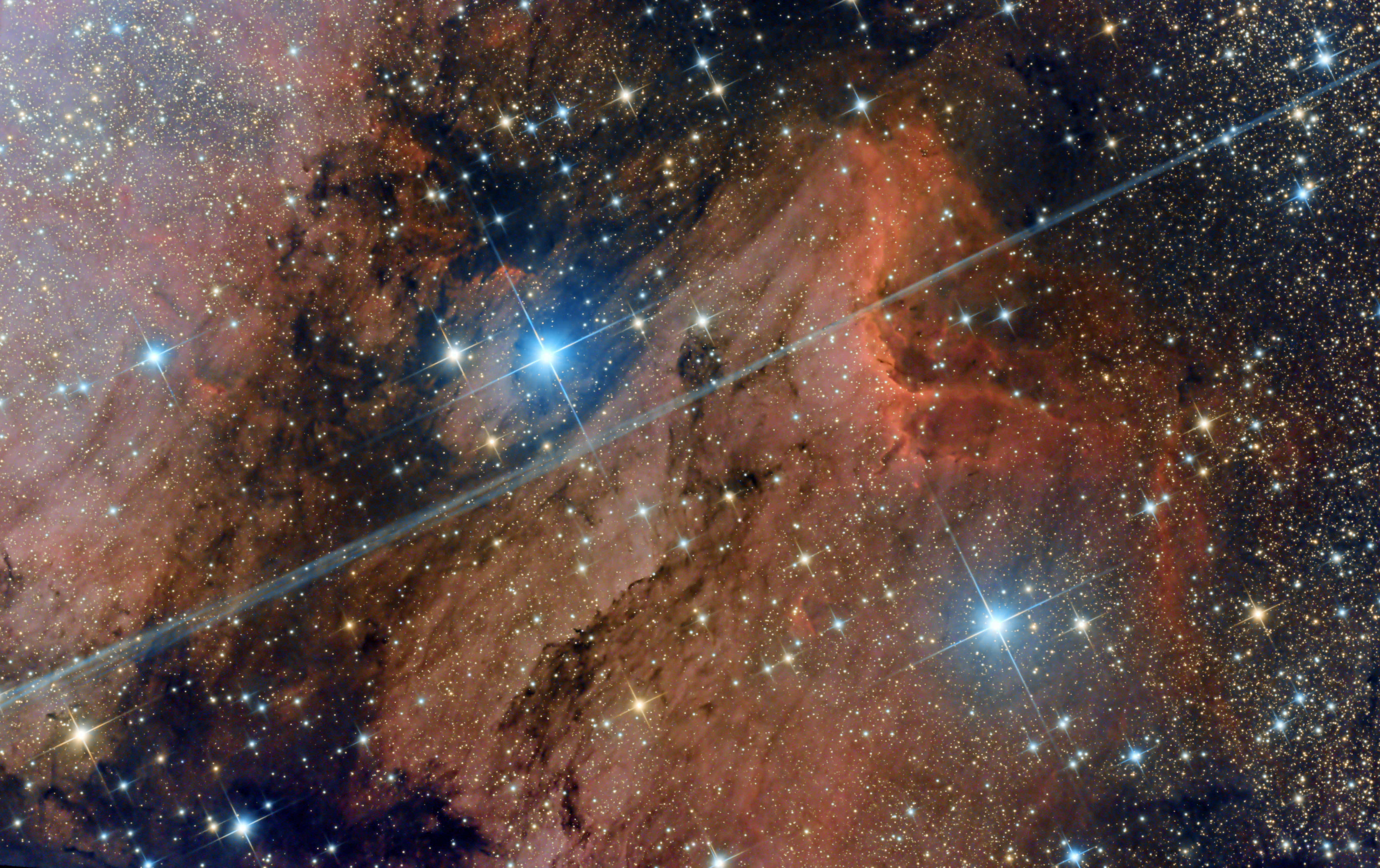 Ich dachte schon, da wäre ein Fussel oder Haar auf dem Kamerasensor, aber es ist der Fangspiegel-Spike des hellen Sterns Deneb, der von rechts oben in das Bild hineingrüßt.