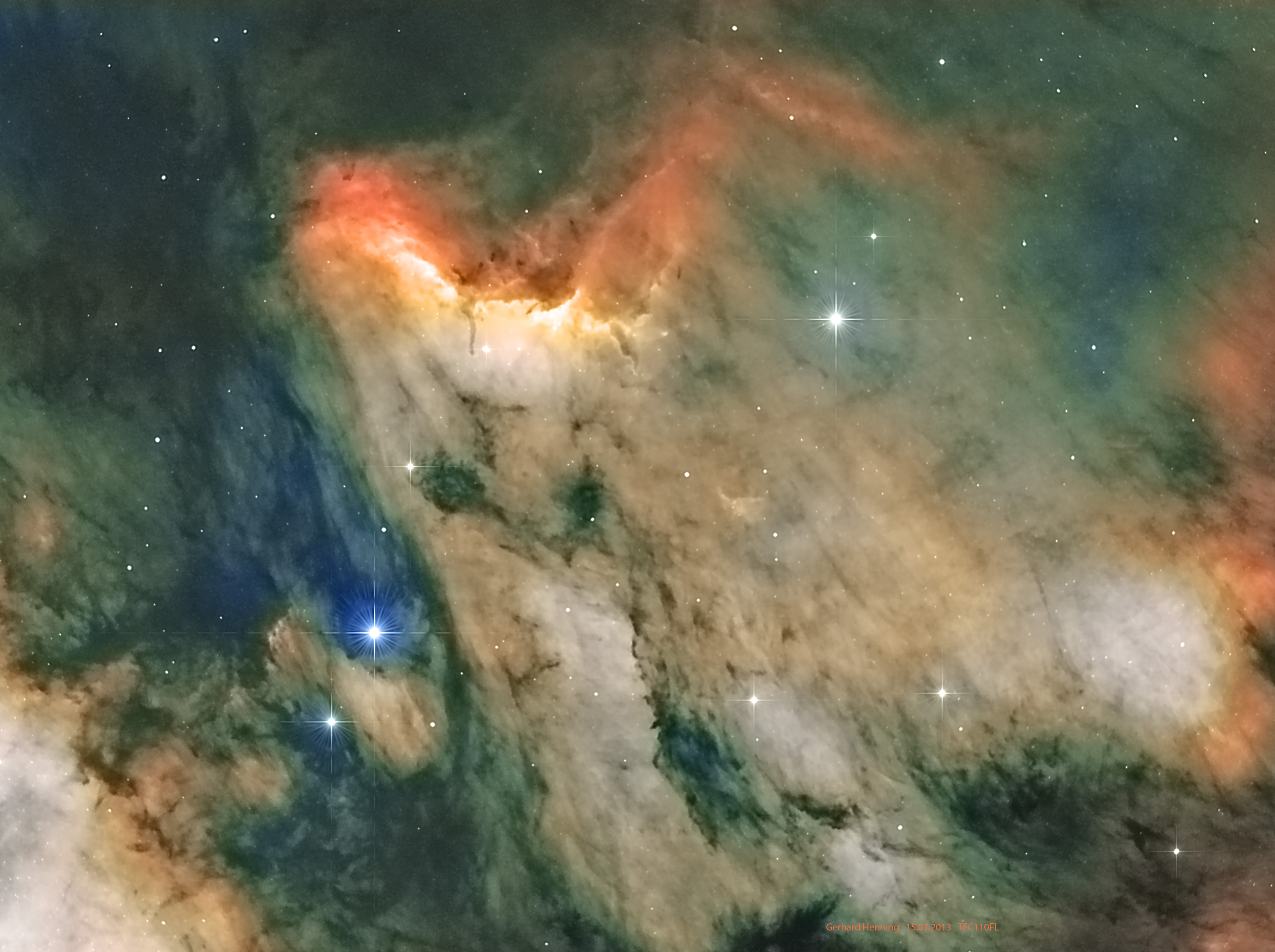 Im Sternbild Schwan sind mehrere Nebelfelder zu entdecken, eines davon ist der Pelikannebel. Gesamtbelichtungszeit: zehn Stunden, Bicolorversion in H-alpha und OIII