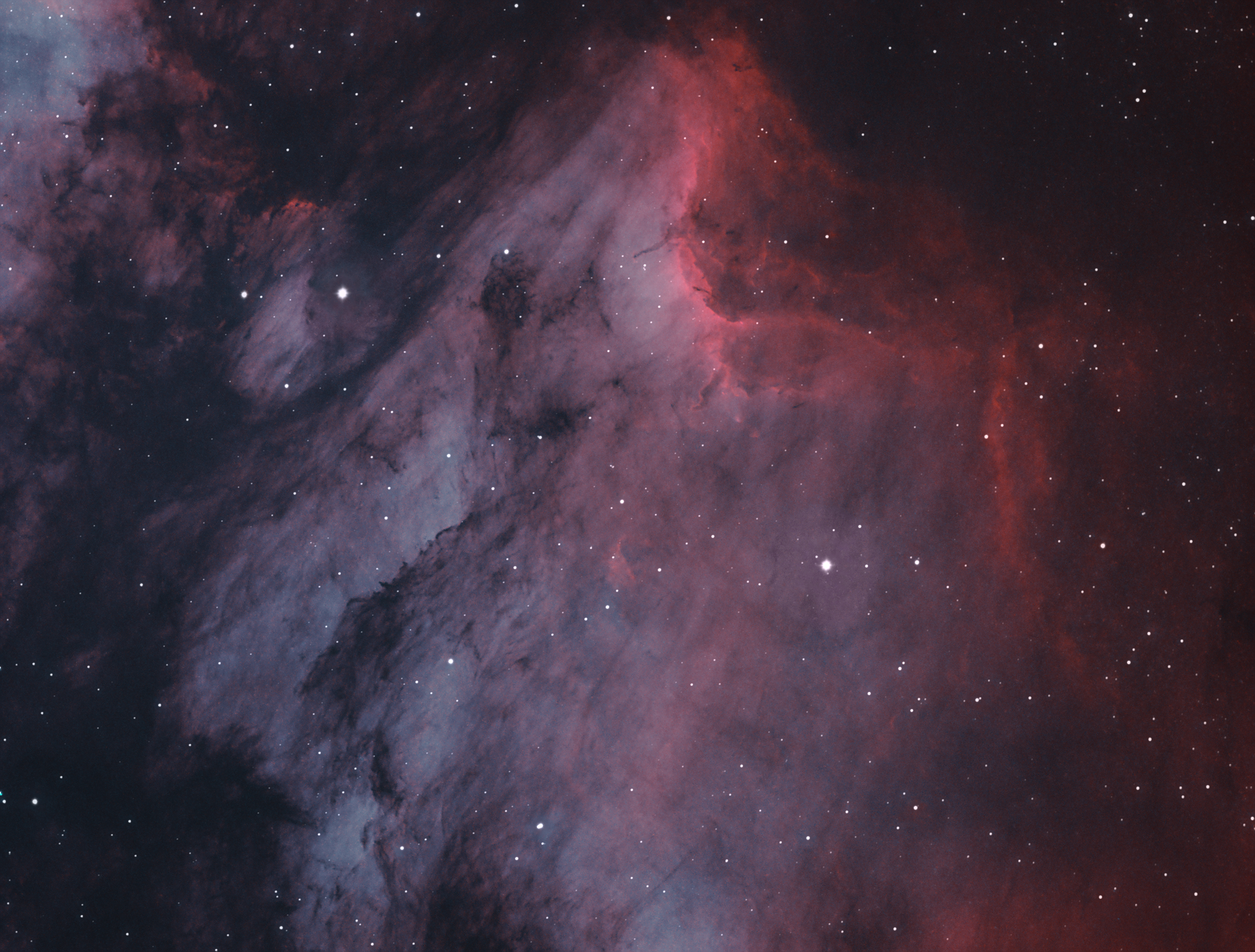 Der Pelikannebel in einer Aufnahme durch H-Alpha-, [OIII]- und [SII]-Filter. Die RGB Farbzuordnung erfolgte über R = H-Alpha + 28 Prozent [SII], G = [OIII], B = [OIII] + 18 Prozent H-Alpha, um einen "quasi-natürlichen" Eindruck zu erzeugen.