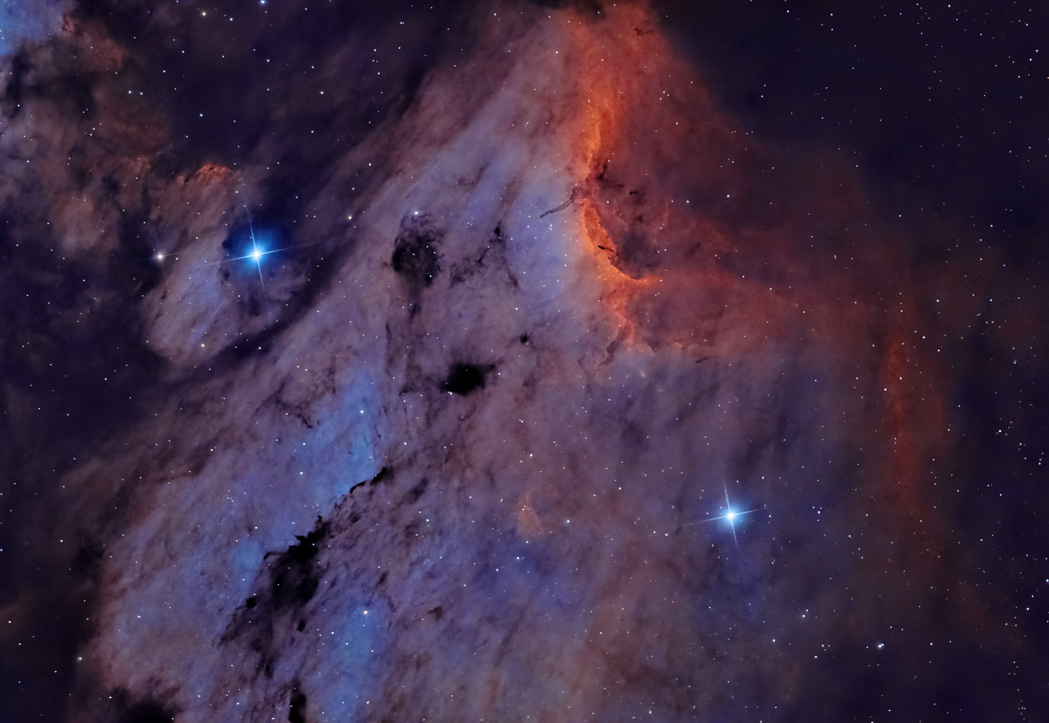 Der Pelikannebel (auch bekannt als IC 5070 und IC 5067) ist eine HII-Region im Zusammenhang mit dem Nordamerikanebel im Sternbild Schwan, dessen gasförmige Formationen eine vorübergehende Ähnlichkeit mit einem Pelikan aufweisen, daher der Name. Der Pelikannebel befindet sich in der Nähe des Sterns erster Größe Deneb und ist von seinem prominenteren Nachbarn, dem Nordamerikanebel, durch eine mit dunklem Staub gefüllte Molekülwolke im Vordergrund getrennt. Beide sind Teil der größeren Region Westerhout 40 HII. Der Pelikan wird viel untersucht, da er eine besonders aktive Mischung aus Sternentstehung und sich entwickelnden Gaswolken aufweist. Das Licht junger energiereicher Sterne verwandelt kaltes Gas langsam in heißes Gas und treibt nach und nach eine Ionisationsfront nach außen. Es sind immer noch besonders dichte Filamente aus kaltem Gas zu sehen, und dazwischen befinden sich zwei Jets, die vom Herbig-Haro-Objekt 555 emittiert werden. In Millionen von Jahren ist dieser Nebel möglicherweise nicht mehr als Pelikan bekannt, da das Gleichgewicht und die Position von Sternen und Gas dazu führen werden, dass etwas völlig anders aussieht.