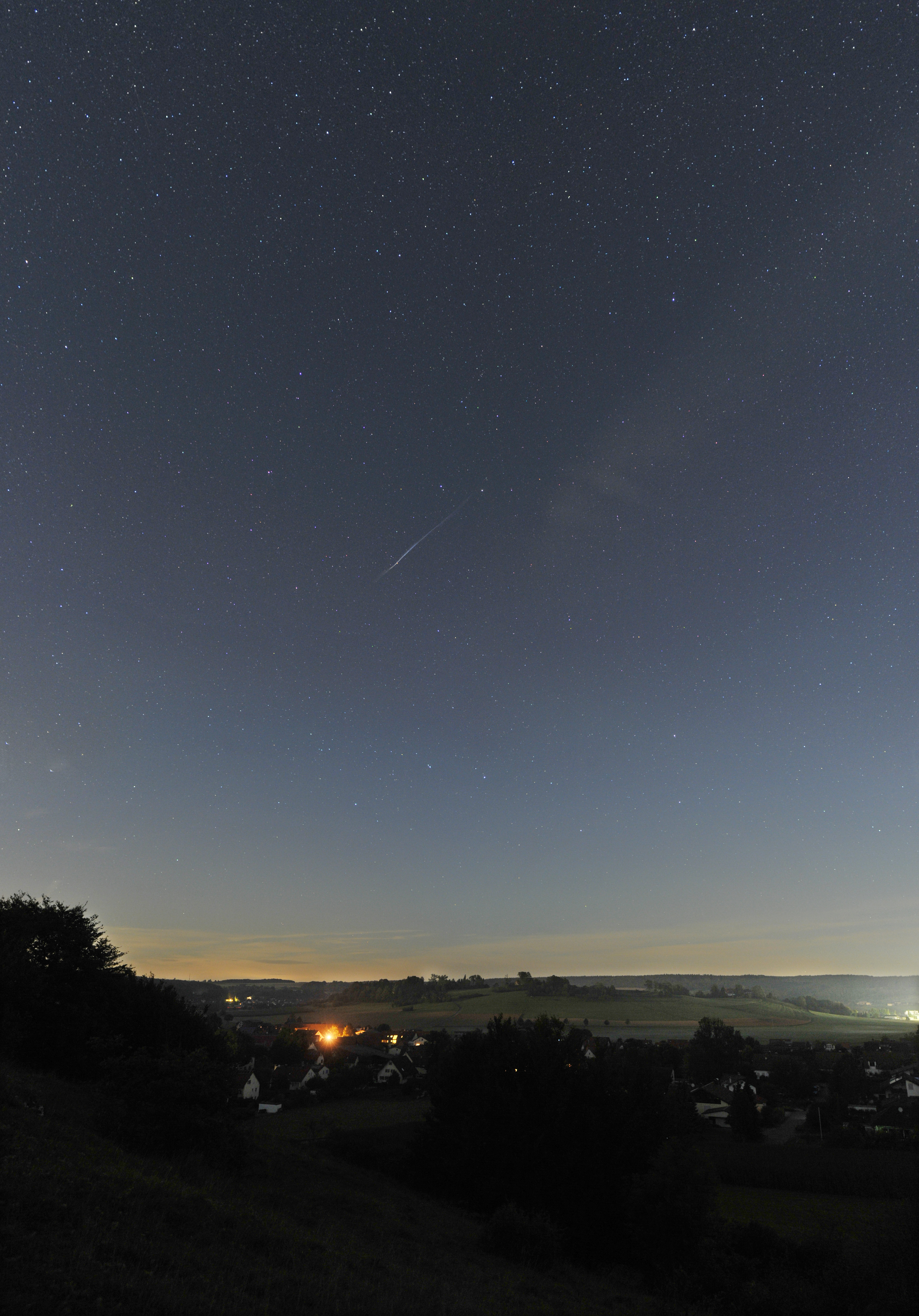 Das Aufleuchten des hellen Perseiden Meteors habe ich fotografisch leider verpasst. Aber die nachleuchtende Spur ist trotzdem sehr deutlich. Die Fotografie wurde vom Kraterrand des Steinheimer Beckens aufgenommen. Dort ist vor knapp 15 Mio. Jahren ein 100 bis 150 m großer Meteorit eingeschlagen. Der Hügel in der Mitte ist der Klosterberg, der Zentralberg des Einschlagkraters. Die Häuser im Vordergrund gehören zum Ortsteil Sontheim, die Lichter rechts bereits zu Steinheim und dahinter liegt in knapp 4 km Entfernung der gegenüberliegende Kraterrand. Gleichzeitig entstand das größere Becken des benachbarten Nördlinger Ries durch den Einschlag eines ca. 1,5 km durchmessenden Körpers. Der Körper, der die oben sichtbare Leuchtspur erzeugte, war dagegen winzig und wurde komplett in der Atmosphäre zerrieben.