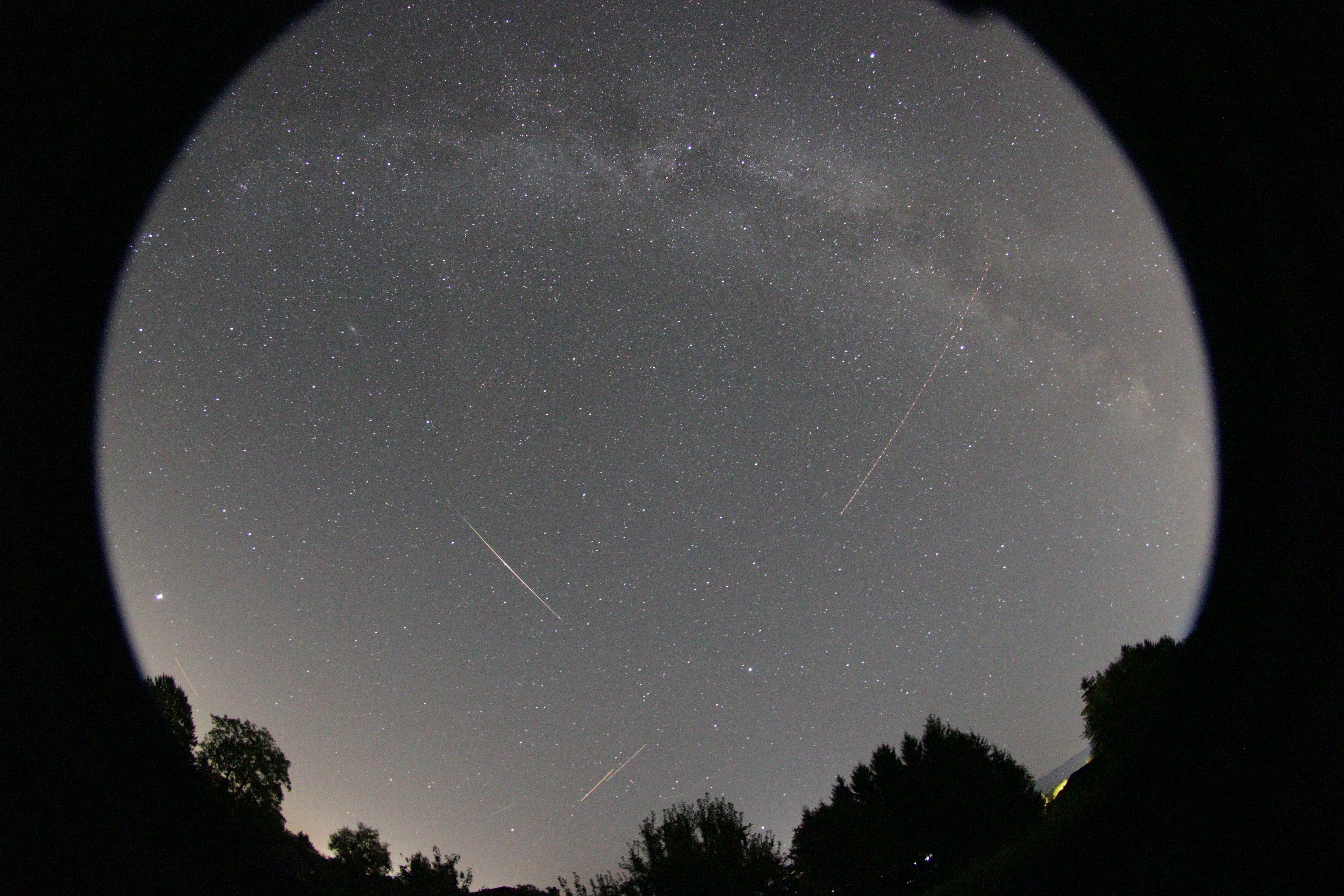 Ob es hier wohl zu einem Zusammenstoß gekommmen ist? Nicht alles, was am Nachthimmel strichförmig abgelichtet ist, ist ein Meteor! Nur der linke ist ein (echter) Perseide!