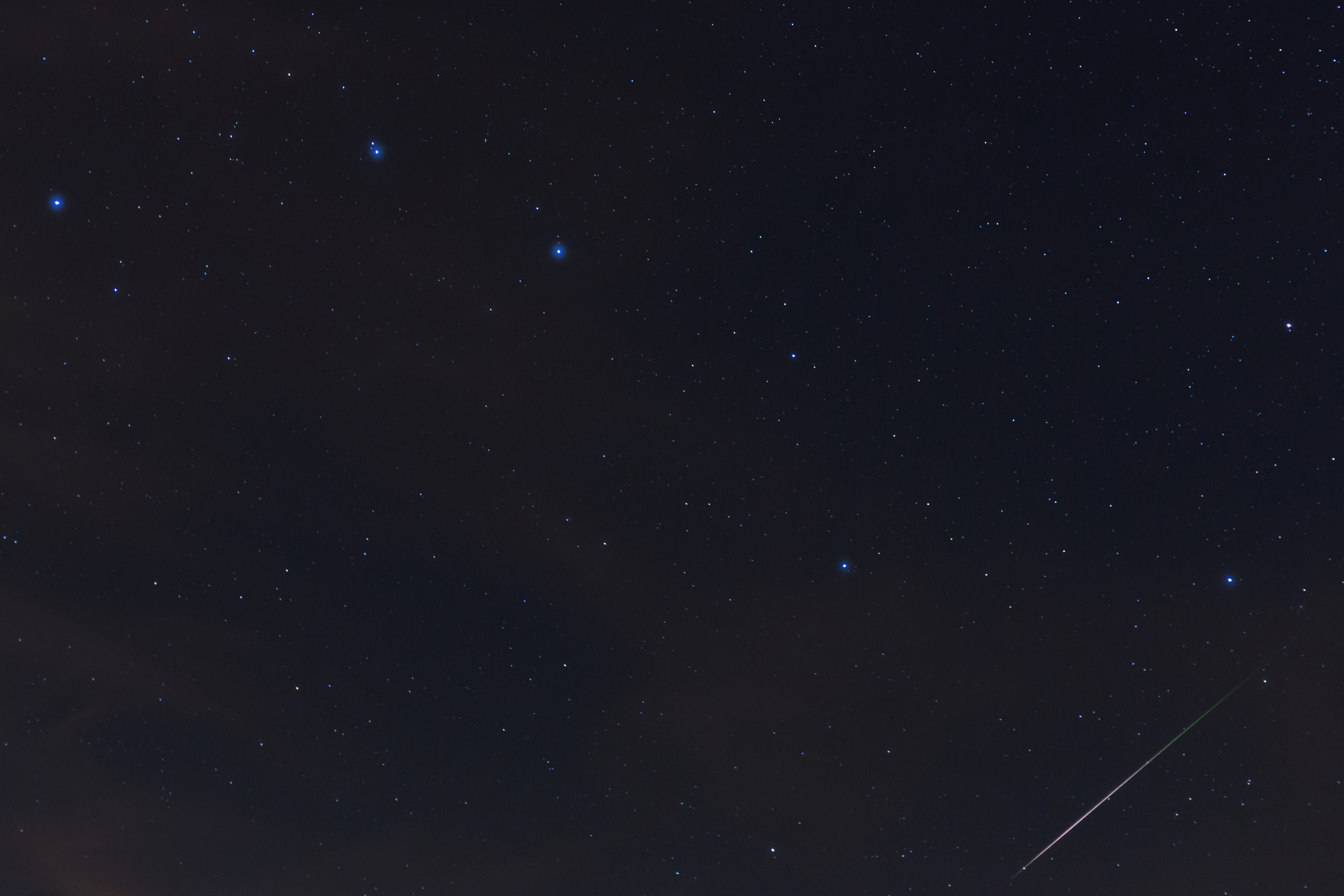 Eine prächtige und farbenfrohe Perseide am Großen Wagen in der Maximumsnacht vom 12. auf den 13. August 2018. Typisch für die Perseiden ist das grüne Leuchten der Spur. Leider verhinderten Zirren über Sachsen eine deutlichere Sicht zum Sternenhimmel, erzeugten allerdings um die helleren Sterne des Großen Wagens einen hübschen Weichzeichnereffekt …