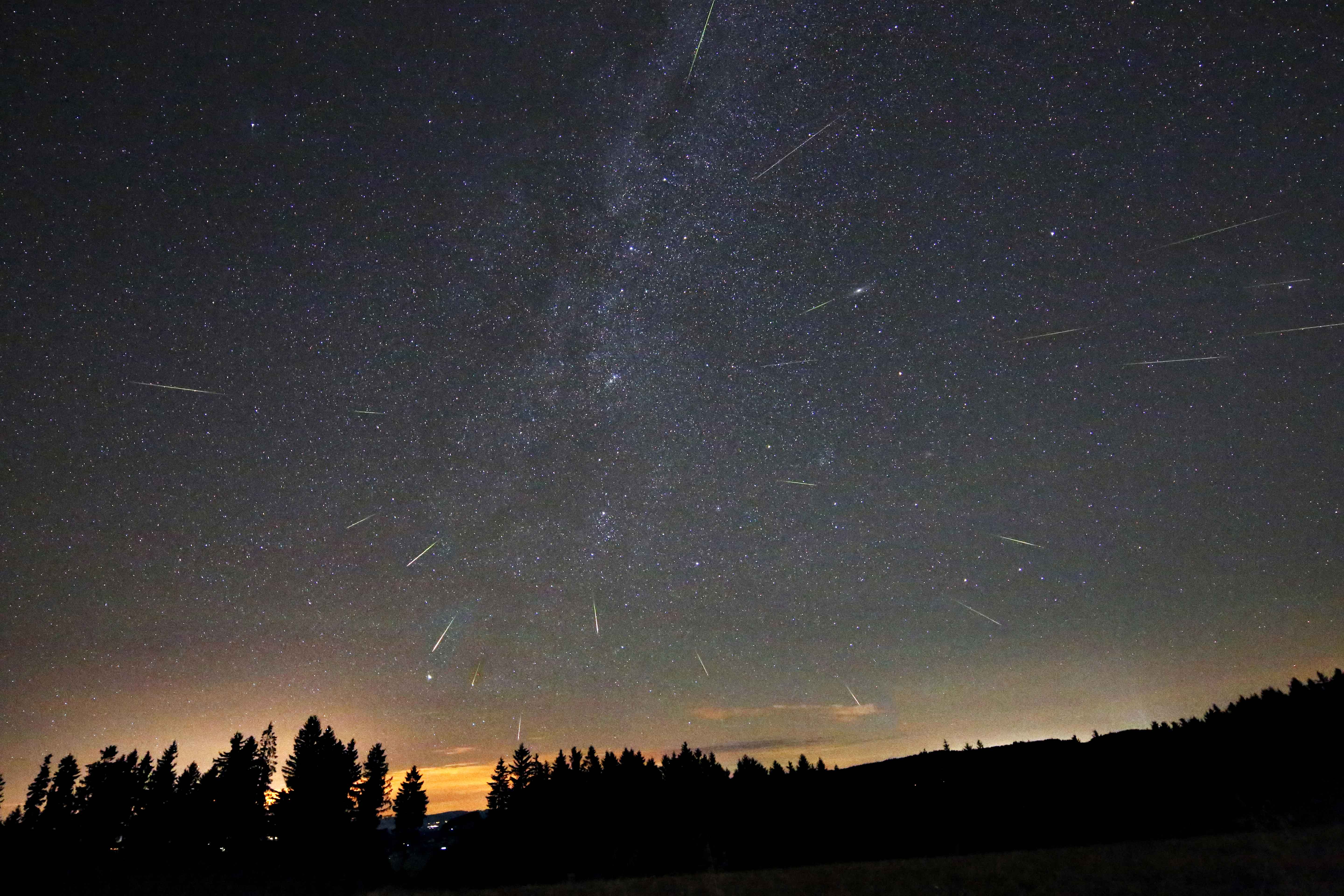In der Nacht vom 11. auf den 12. August 2012 (Samstag auf Sonntag) führte ich meine Kamera den Sternen nach und richtete sie auf das Sternbild Perseus aus. Mein Ziel war, die hellsten Perseiden auf einem Bild zu vereinigen. Von den insgesamt 735 Aufnahmen wählte ich die 16 hellsten Sternschnuppen aus und kombinierte sie zu einem Bild.