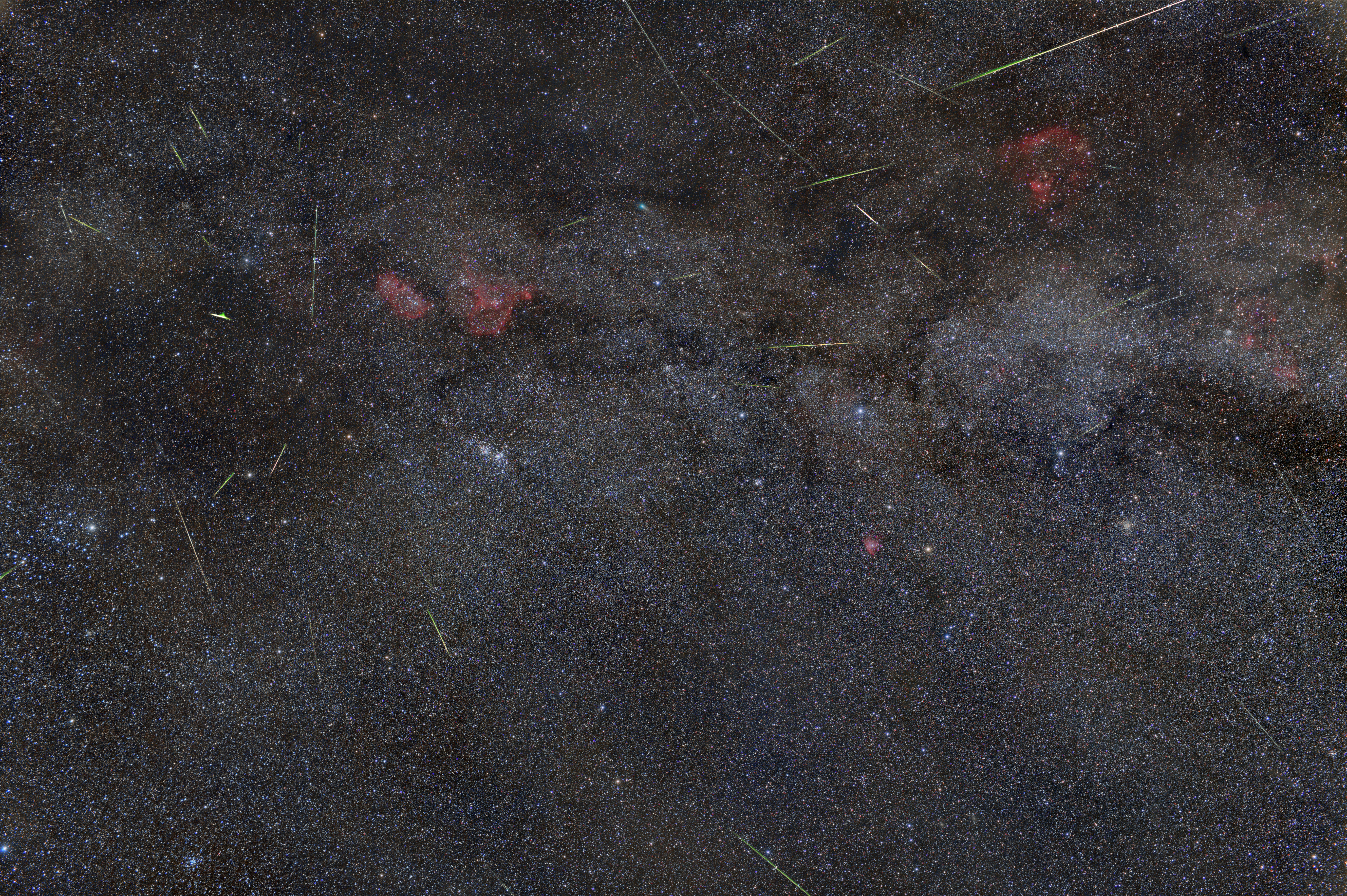 Eine mondlose und vor allem sehr klare Nacht bescherte beste Bedingungen für das Perseiden-Maximum 2018. Vier Stunden wurde in Ein-Minuten-Intervallen belichtet, und die Bilder so bearbeitet, dass sowohl die Kulisse der Milchstraße als auch die Meteore, aber auch der gerade im Bildfeld befindliche Komet Giacobini-Zinner alle zur Geltung kommen. Mehr Bilder und Infos: https://www.astrobin.com/362366/