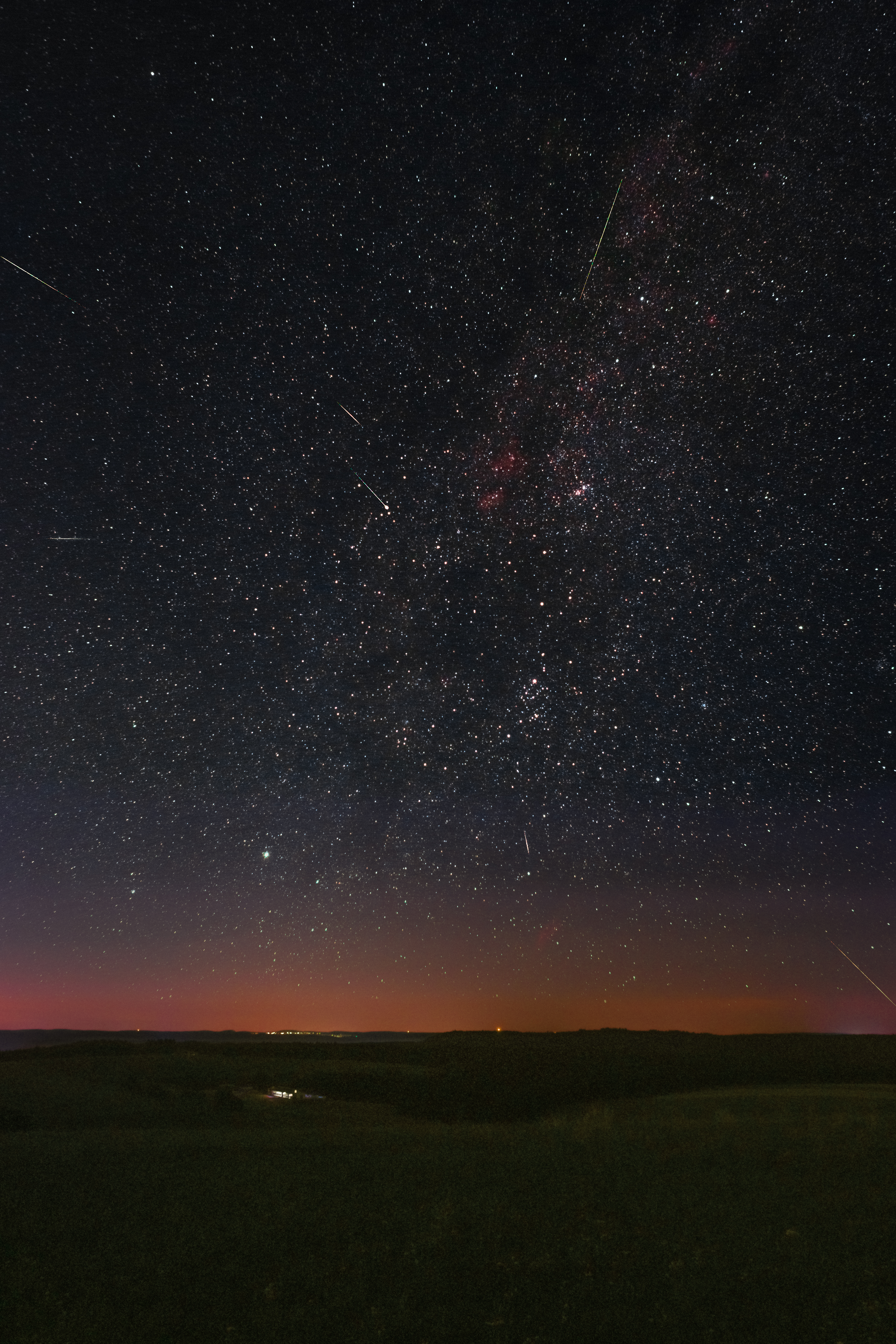 Die Perseiden 2018 vom Gipfel des Witthohs nahe Tuttlingen aus fotografiert. Zuerst habe ich während der blauen Stunde die Landschaft aufgenommen. Danach habe ich die Kamera auf den Radianten nachgeführt und viele Einzelbelichtungen erstellt. Dann habe ich per Stacking ein Bild vom Sternenhimmel ohne Meteore erstellt. In dieses Bild habe ich anschließend Meteore aus ausgewählten Aufnahmen hinzugefügt. Schließlich habe ich die Landschaft montiert. Neben den Meteoren sind auch einige rote Emissionsnebel sichbar.