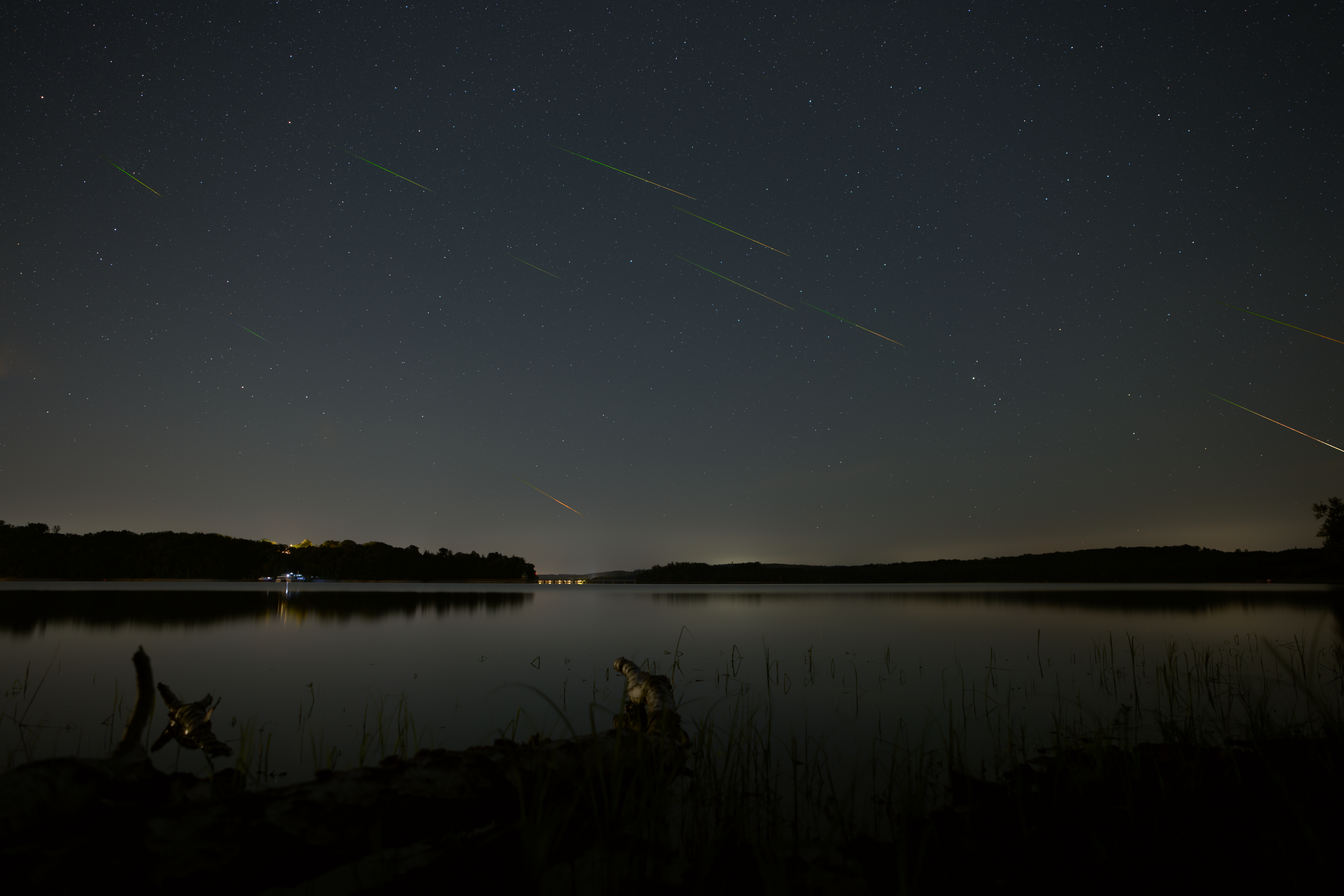 Nach langer Suche nach einem geeigneten Platz, um die Perseiden in diesem Jahr (2024) zu beobachten und zu fotografieren, habe ich einen Platz am Möhnesee gefunden, der sowohl einen schönen Vordergrund, als auch nicht so starke Lichtverschmutzung in Richtung Osten bietet. Am Ende konnte ich 13 Meteore einfangen, von denen ich elf in dieser Bildkomposition verwendet habe. Die Meteore stehen dabei nicht in Relation zum Sternenhimmel, sondern zum Bildausschnitt.