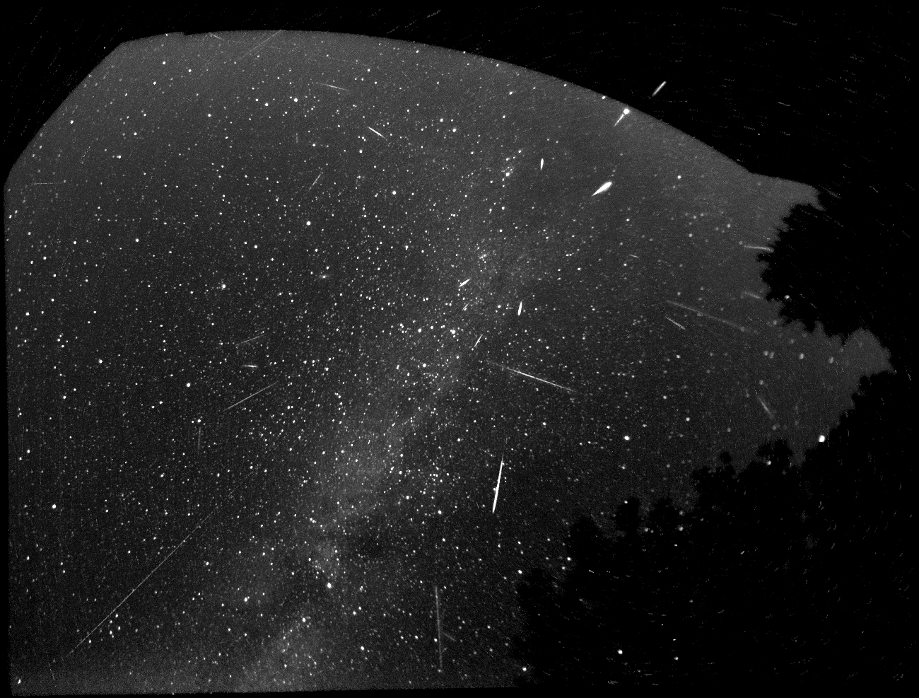 Aus 1100 Bildern, die in der Nacht zum 14. August 2023 aufgenommen wurden, habe ich die Sternschnuppen zusammen in ein Bild montiert. Ergebnis war eine Zenitrate (ZHR) von um die 50 Meteore pro Stunde für die Perseiden. Die Aufnahmen hatten eine Belichtungszeit von 5 Sekunden, die mit einem kleinen Weitwinkel (2,1 mm Brennweite) an einer ASI120MM_Kamera gemacht wurden. Das brauchbare Gesichtsfeld hatte ca. 80° x 100°, begrenzt von Bäumen und Gebäuden. Die Tiefe der Aufnahmen lag bei ca. 6,5 mag, was in etwa dem visuellen Eindruck entsprach. Im Summenbild sind über 30 Meteore zu sehen, von denen 23 sicher Perseiden gewesen sind. Die Zeitdauer der gesamten Belichtungszeit war fast 1,5 Stunden. Wenn der Himmelsausschnitt auf den ganzen Himmel hoch gerechnet wird, und unter Berücksichtigung der Höhe des Radianten im Perseus, ergibt sich eine Zenitrate von circa 50 Meteore pro Stunde am 14. August 2023 gegen 2:15 uhr MESZ.