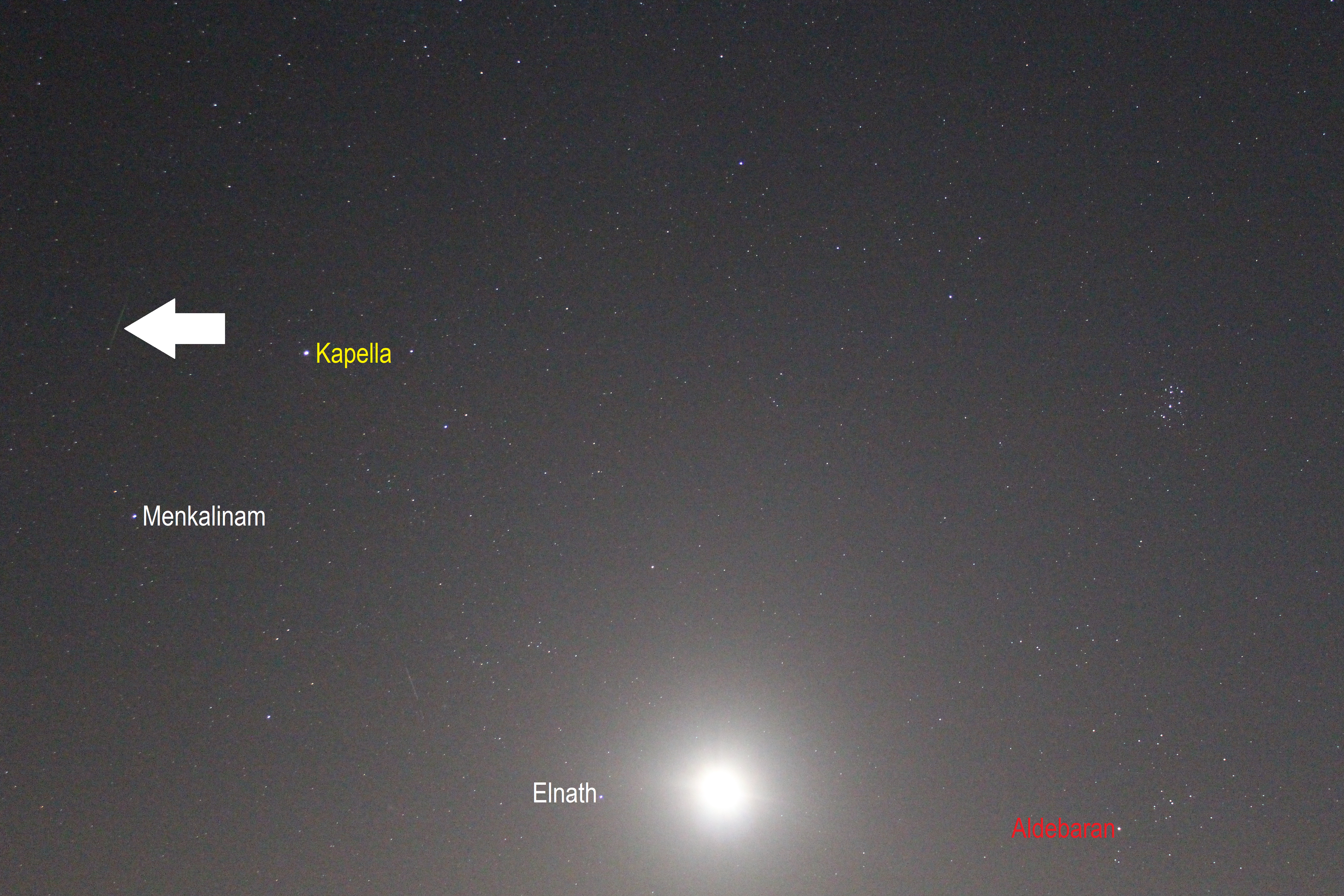 Leserbilder Astronomie: Perseiden-Meteor im Sternbild Fuhrmann (Objekte beschriftet und Meteor mit einem Pfeil markiert)