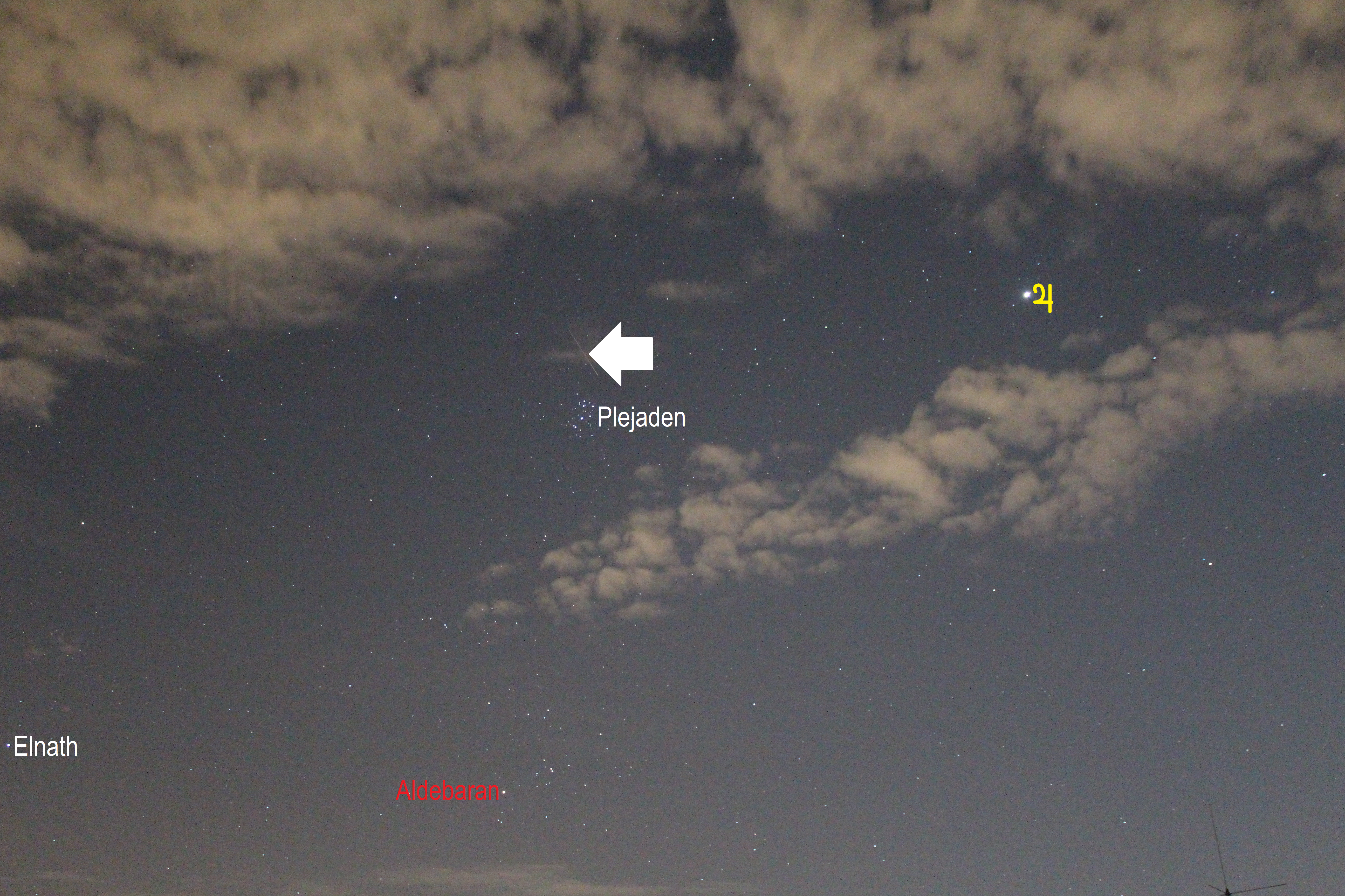 Perseiden-Meteor im Sternbild Stier, aufgenommen im Zuge der Erstellung einer zeitgesteuerten Fotosequenz des nordöstlichen Sternenhimmels. Leider vereitelten aufziehende Wolken kurz danach jegliche Versuche Perseiden-Meteore zu fotografieren.