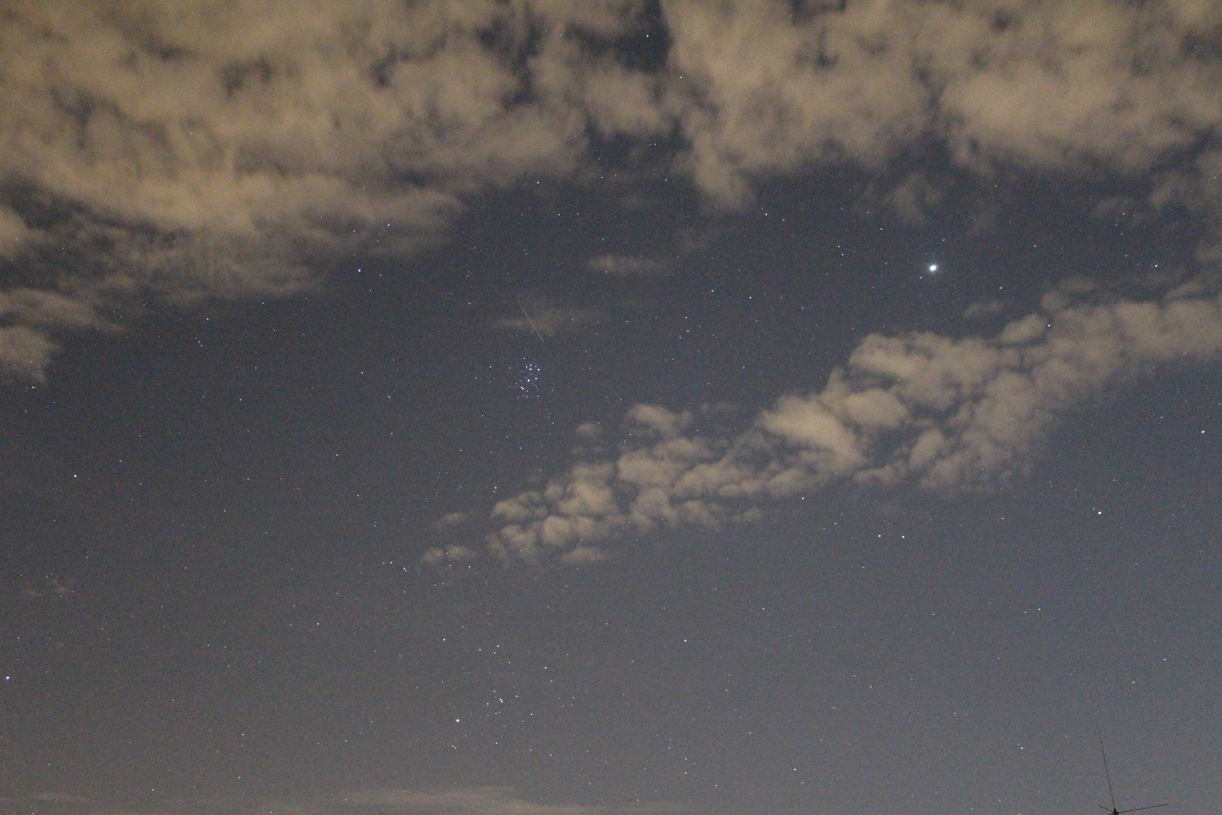Perseiden-Meteor im Sternbild Stier, aufgenommen im Zuge der Erstellung einer zeitgesteuerten Fotosequenz des nordöstlichen Sternenhimmels. Leider vereitelten aufziehende Wolken kurz danach jegliche Versuche, Perseiden-Meteore zu fotografieren.