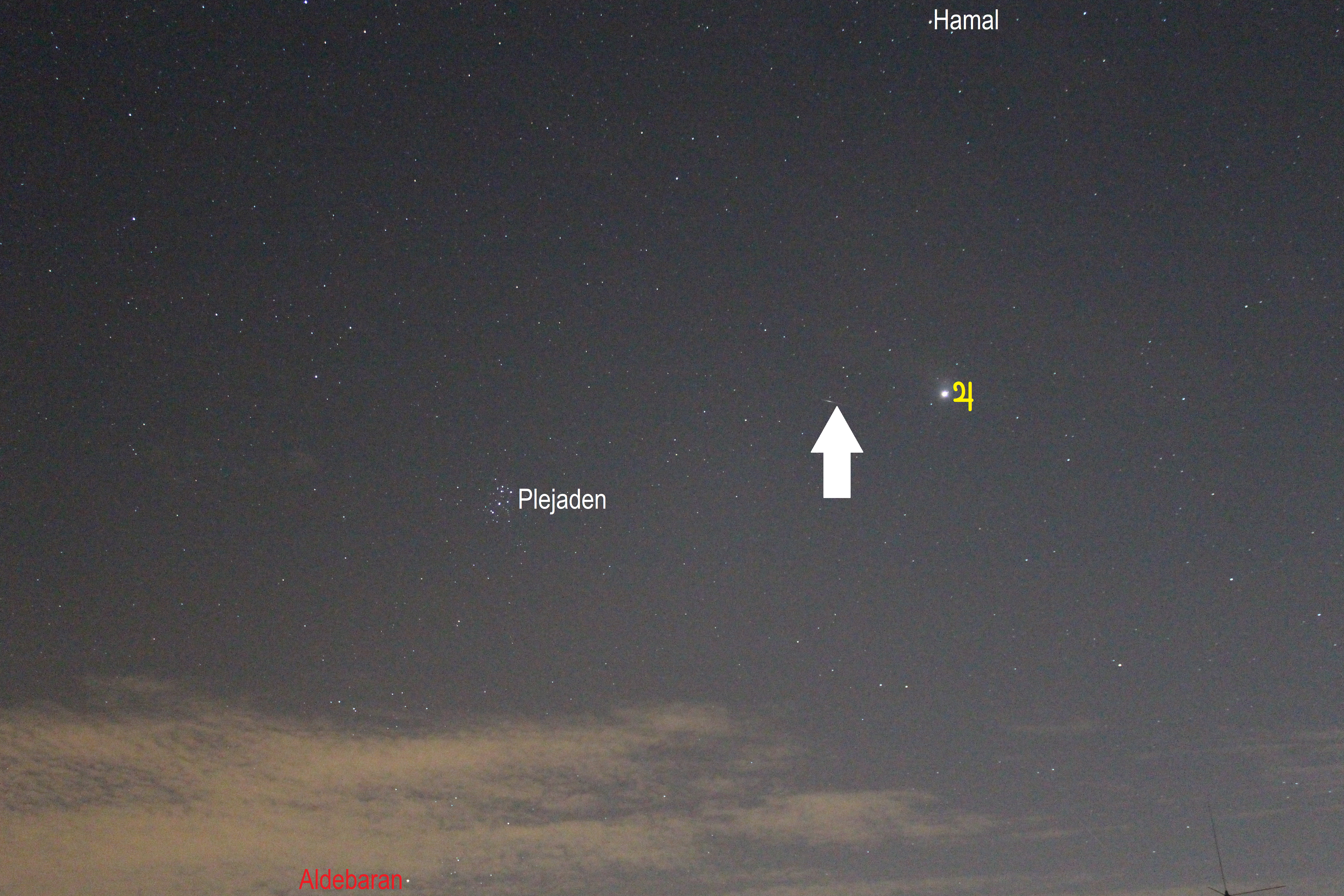 Leserbilder Astronomie: Perseiden-Meteor im Sternbild Widder (Objekte beschriftet und Meteor mit einem Pfeil markiert)