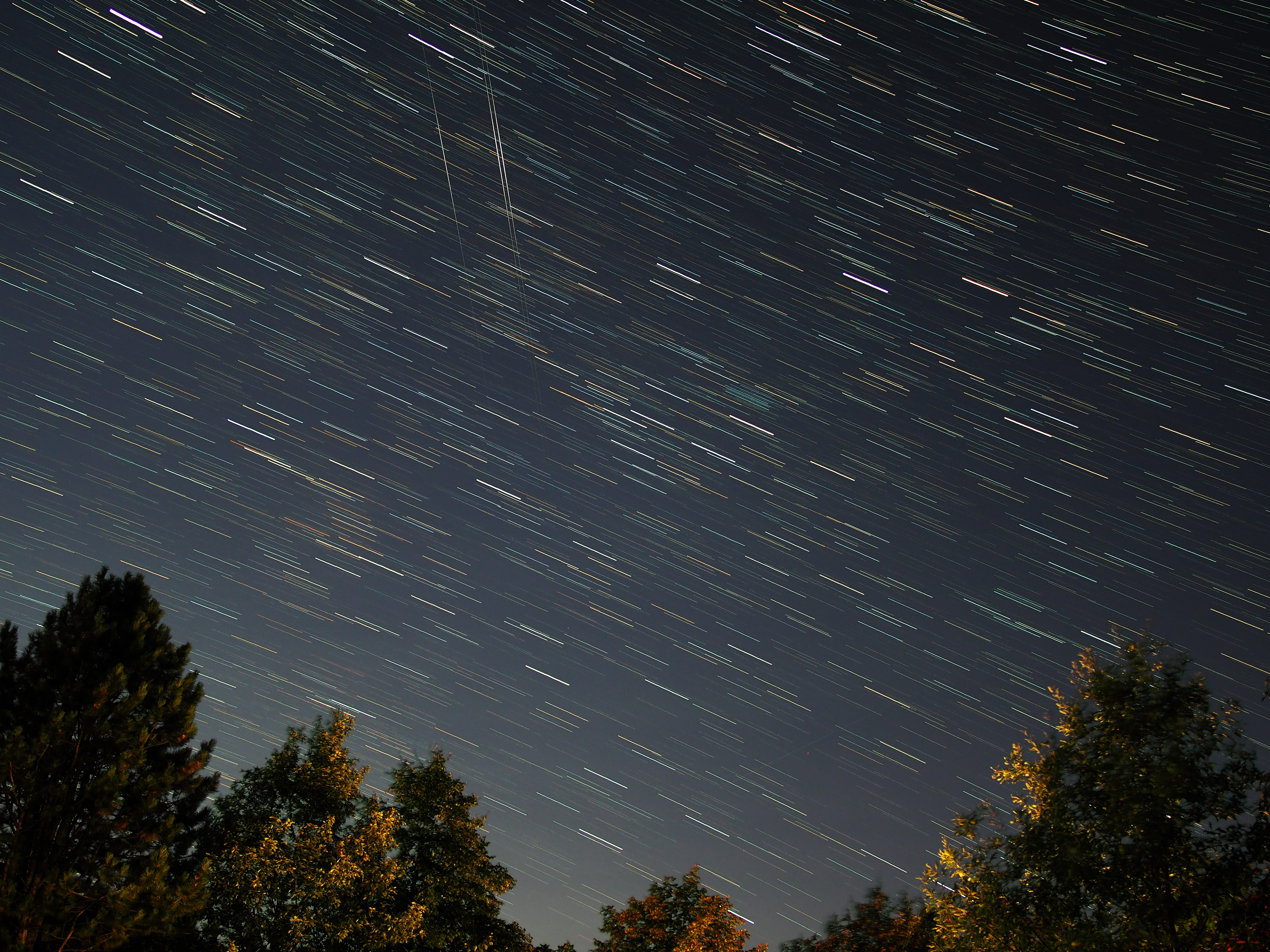 So ein Foto in der Perseidennacht, da kommt erst mal große Freude auf. Bei genauem Hinsehen allerdings sehen die drei Spuren doch etwas verdächtig anders aus. Keine grünliche Farbe, vor und nach der Aufhellung immer noch als schwache Spur, dazu genau parallel und die Aufhellungen der drei Spuren alle auf gleicher Höhe. Wohl eher drei Satelliten. Vielleicht kann ja die Redaktion Aufhellung in diese Lichterscheinung bringen.