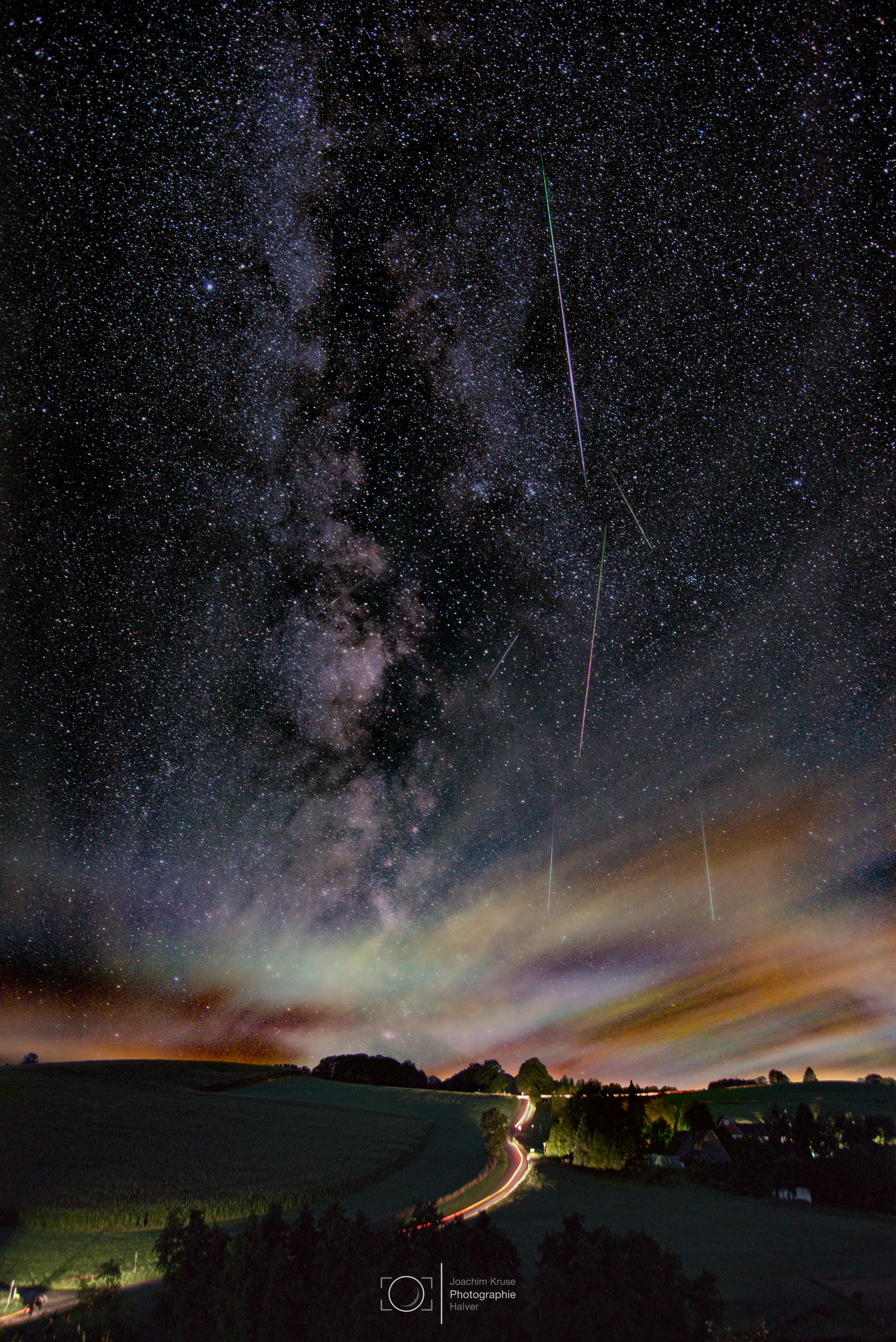 In den Nächten um den 13. August herum prasselten bei uns im Märkischen Sauerland mehr Regenschauer als Sternschnuppenregen vom Himmel herab. Immerhin gab der Himmel am 14. des Monats zwischen den neu aufziehenden Wolkenfeldern für 1 Stunde den Blick auf die Sterne frei. Ein paar der schnell aufblitzenden Meteore ließen sich dabei zum Glück ablichten.