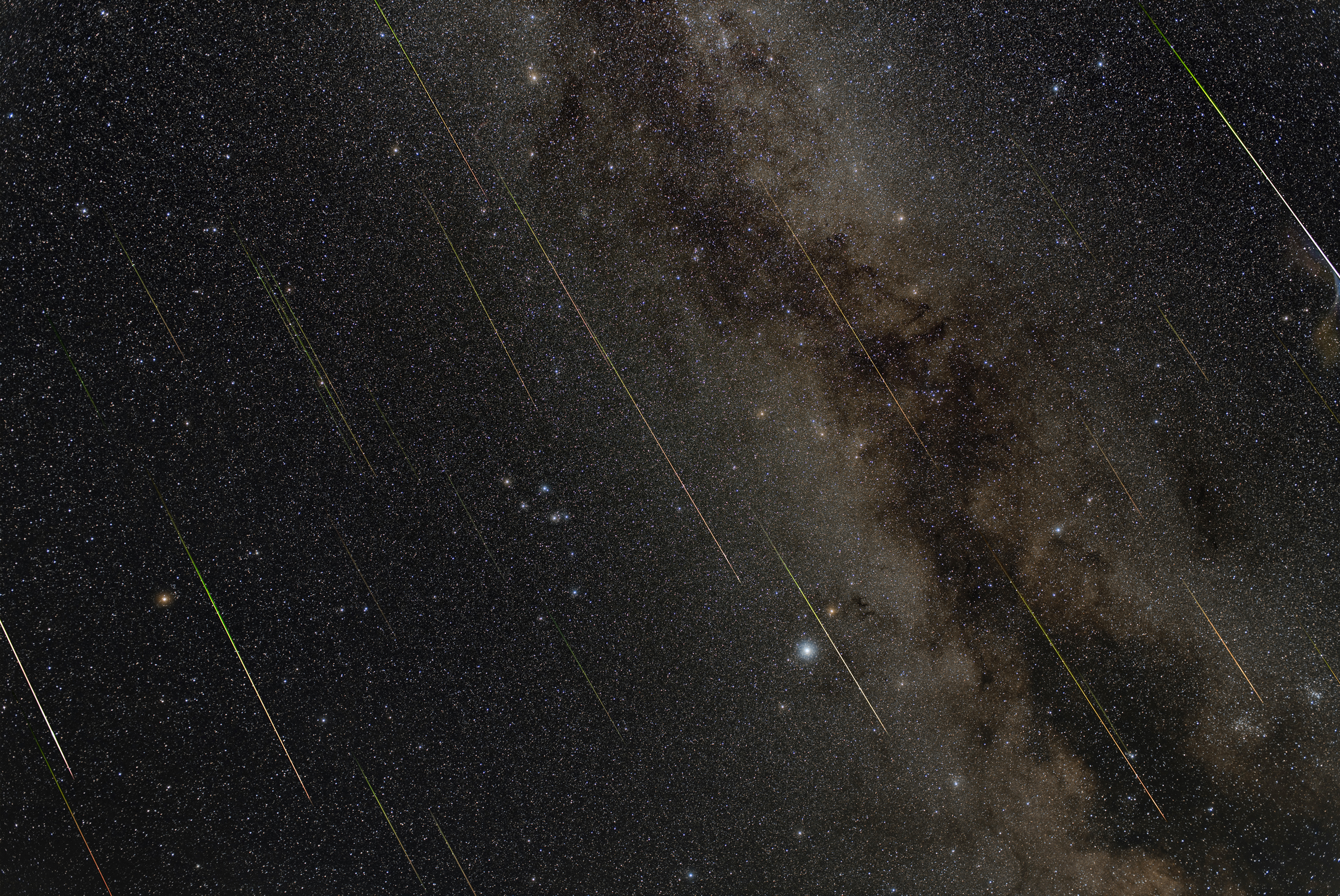 Perseiden vom 12. auf 13. August 2023 vor den Sternbildern Adler und Delfin über einen Zeitraum von vier Stunden, sowie drei Minuten mit Weichzeichner.