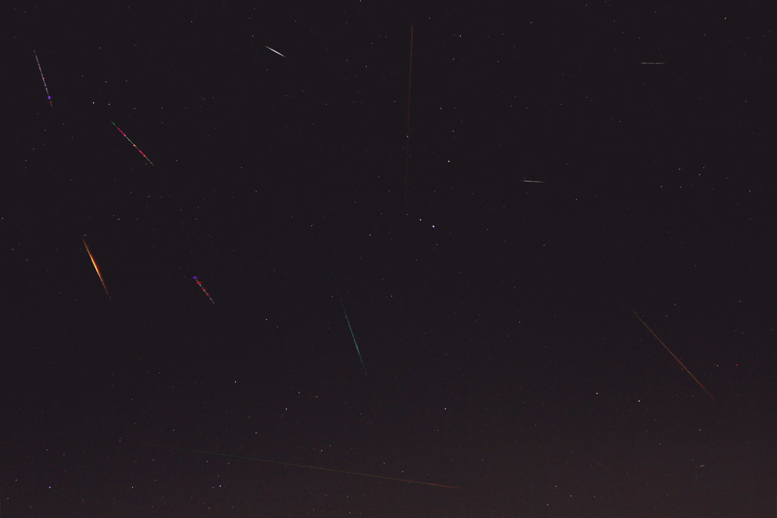 Vom 10. bis 12. August 2012 richtete ich meine Kamera Richtung Südosten aus und schoss rund 2000 Bilder. Die daraus selektierten Meteoriten vergrößerte ich um rund 40 Prozent und setzte sie anschließend zu einem Gesamtfoto zusammen. Man kann schön die farblichen Unterschiede der einzelnen Meteoriten beim Verglühen erkennen.