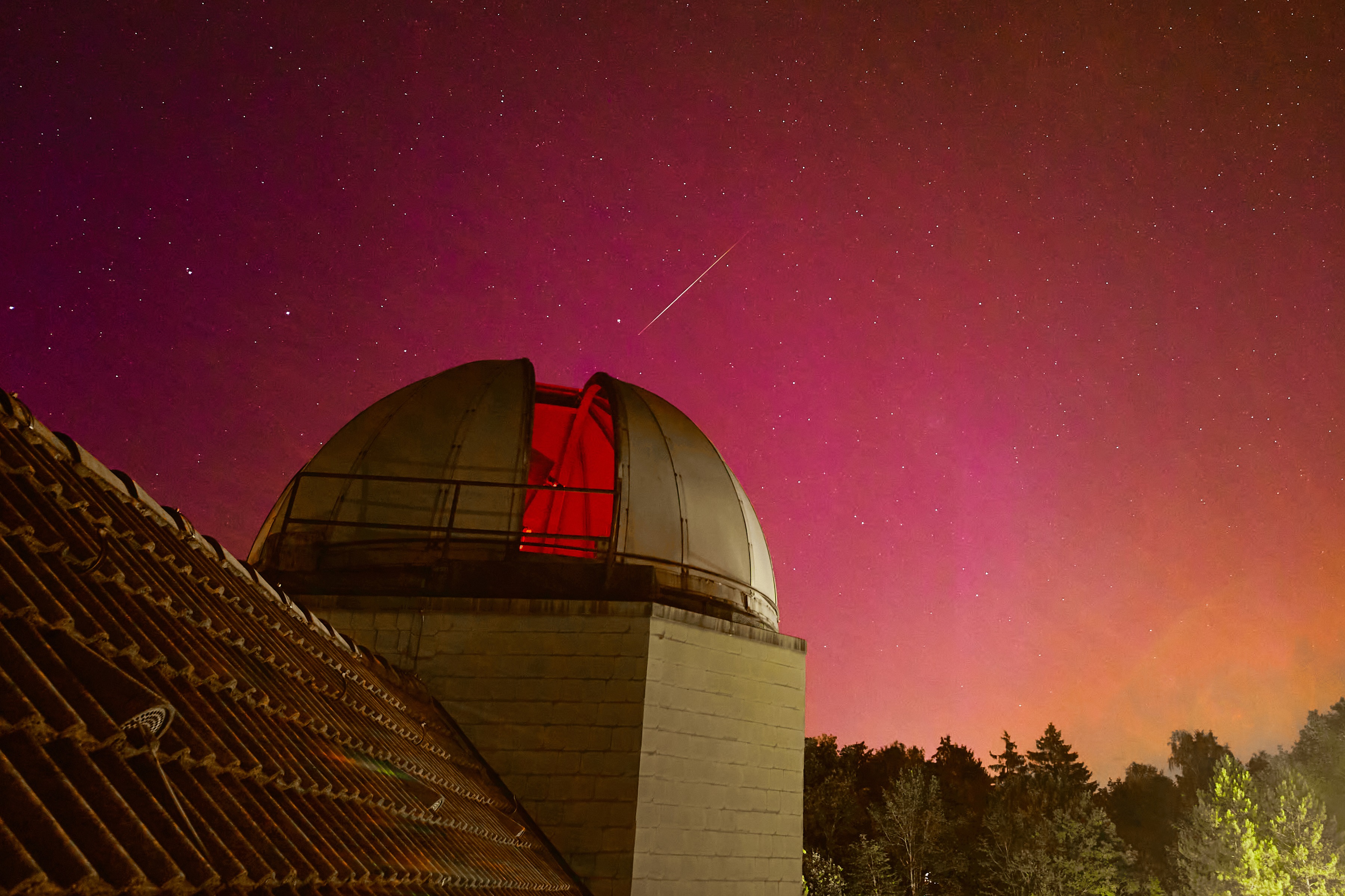 In der Nacht zum 12. August gelang mir dieses Bild an der vhs-Sternwarte Neumünster. Zu sehen sind gleich zwei astronomische Highlights: Ein Perseidenmeteor sowie Polarlicht. So etwas kam mir gleichzeitig noch nicht vor die Linse. Dabei scheint der Meteor direkt in die geöffnete Kuppel bzw. in das dortige 19-Zoll-Newton-Teleskop zu fallen.