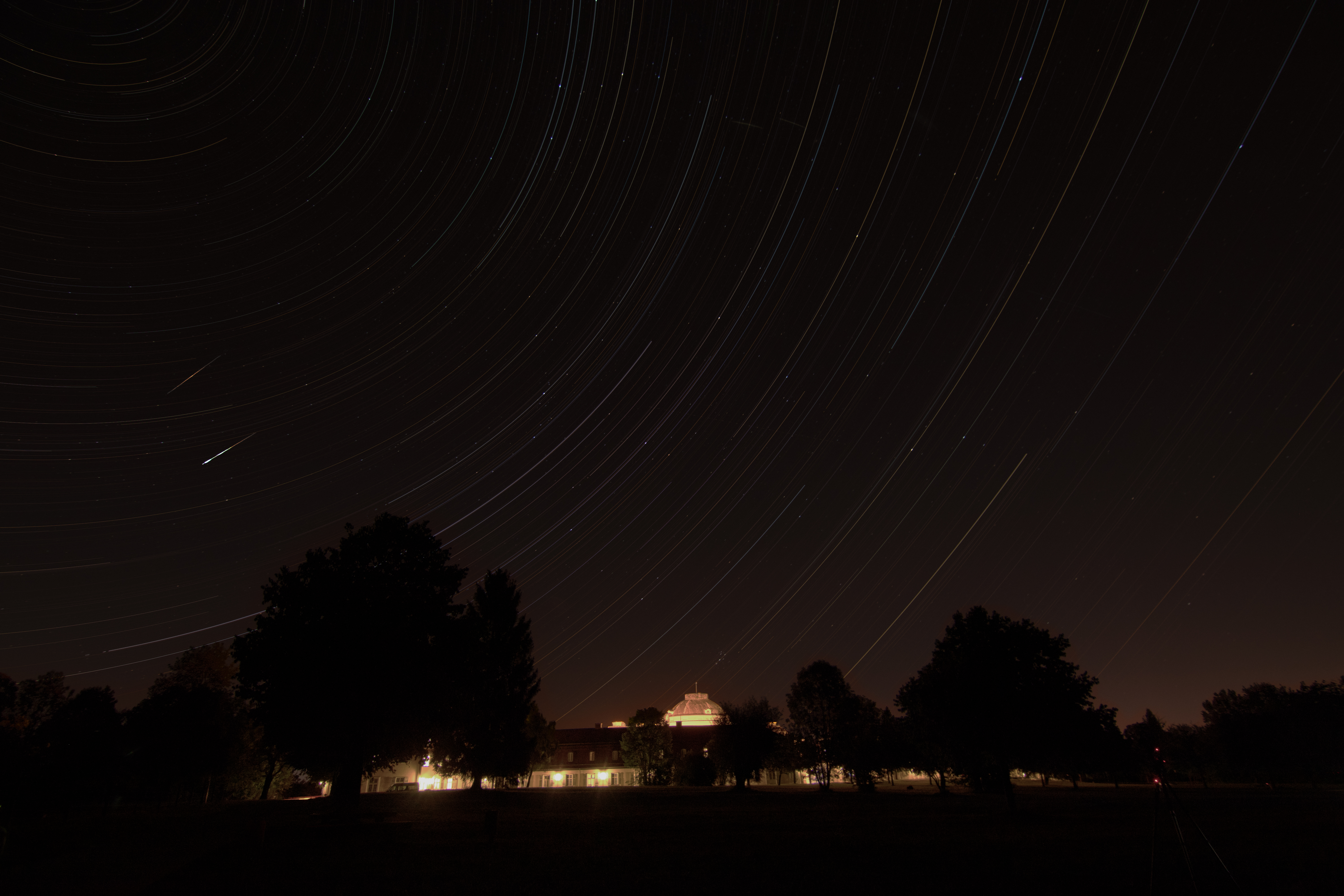 Diese Aufnahme entstand am Schloß Solitude in Stuttgart. Es ist ein Komposit aus einer HDR-Aufnahme des Vordergrundes und einer Strichspuraufnahme von rund vier Stunden Dauer, sowie einer Einzelaufnahme mit dem Sternbild Perseus und den Plejaden über dem Schloß. Wie das Schicksal so spielt, sah ich mit bloßem Auge viele, auch sehr helle Sternschnuppen, die waren aber überall zu sehen, nur fast nicht in Richtung meines Fotoobjektivs. Aber egal diese Perseidennacht in reizvoller Umgebung war trotzdem wunderschön.