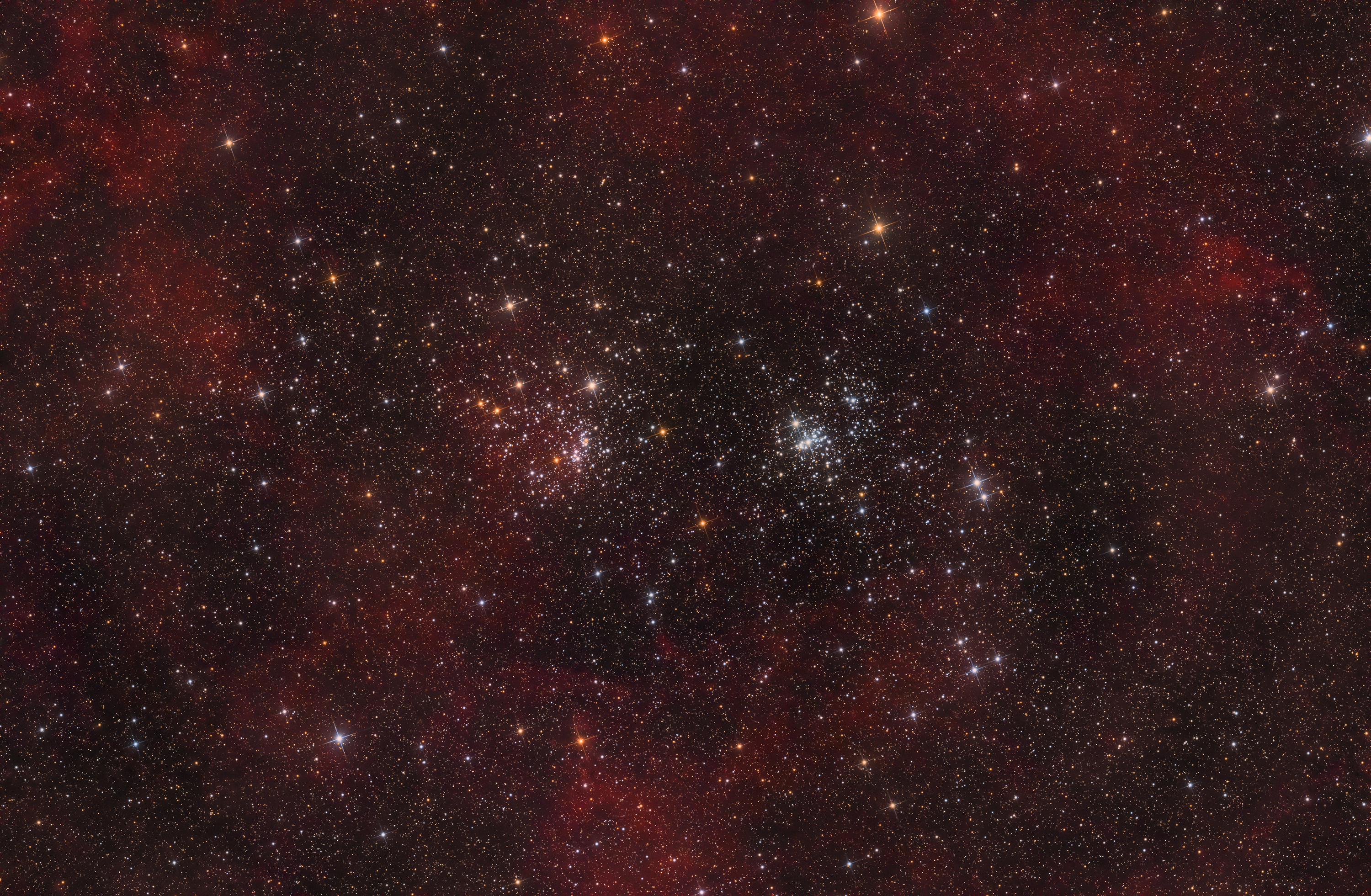 Ich hatte dieses Foto fast ein Jahr lang geplant, nachdem ich herausgefunden hatte, dass das Gebiet, in dem sich der Perseus-Doppelhaufen befindet, sehr reich an ionisiertem Wasserstoff ist, wenn auch extrem schwach. Um dieses Bild zu erstellen, wurden dre Teleskope, zwei Kameras und drei verschiedene Filter verwendet. Tatsächlich wurden die Sterne breitbandig mit dem Konus bei einer Brennweite von 950 mm abgebildet (was ein 2x2-Mosaik erforderte, um ein so weites Feld zu haben) und der Hintergrund aus ionisiertem Wasserstoff wurde teilweise von mir mit dem Refraktor ED80 und einer Farbkamera abgebildet teilweise von meinem Freund Alessandro de Pace mit seinem Askar FRA600 und seiner Monochromkamera. Insgesamt haben wir fast 70 Stunden Signal zwischen Breitband und Schmalband gesammelt.