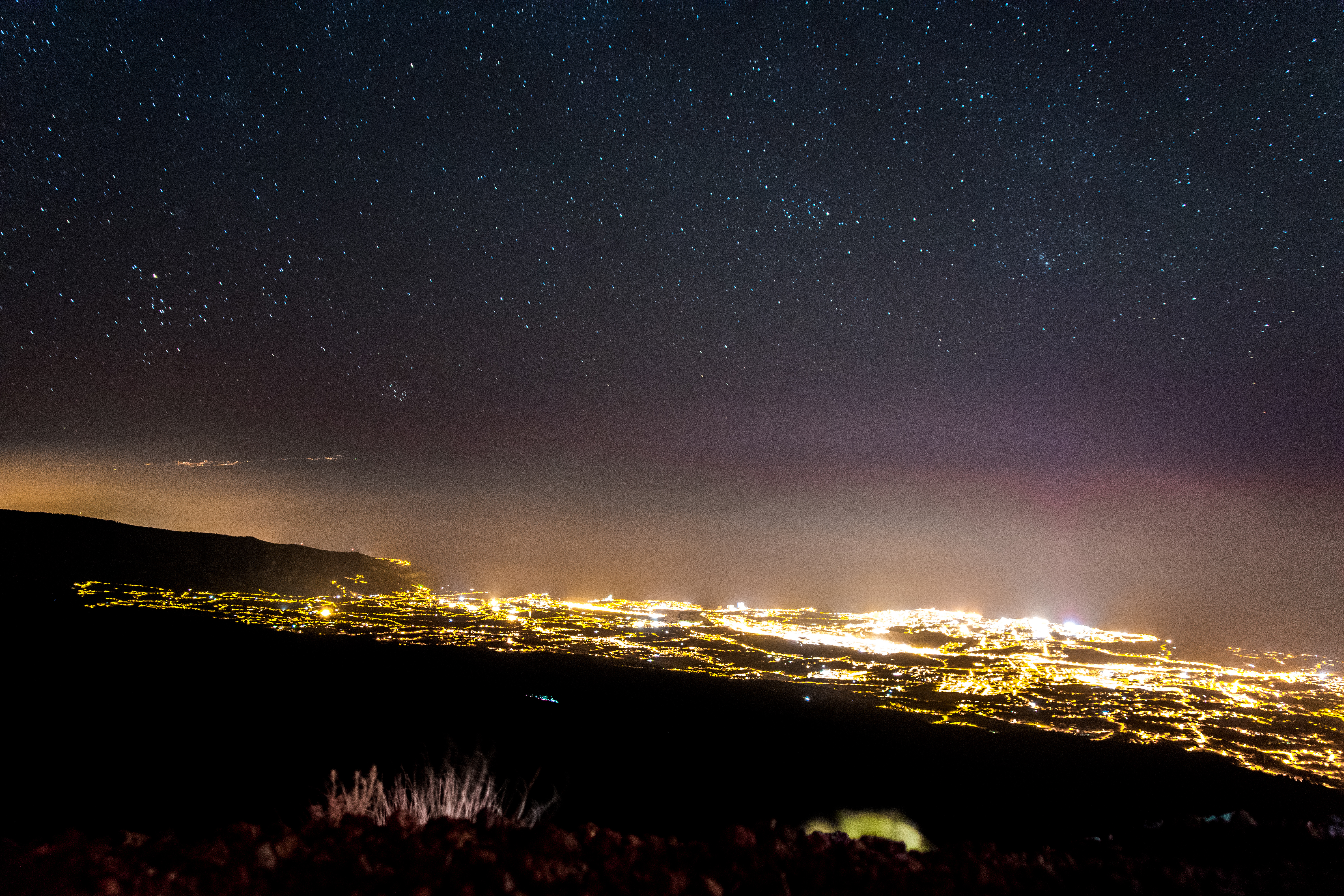 Anfang Februar verweilte ich eine Woche auf Teneriffa. Die ersten Tage des Monats nutzte ich nach Monduntergang für Astroaufnahmen. Diese Aufnahme entstand auf etwa 2000 m, etwas unterhalb des Slooh-Observatoriums auf dem Berg Izaña nahe des Vulkans Teide. Von einem Aussichtspunkt konnte man die Lichter der Stadt Puerto de la Cruz auf der Nordwestseite der Insel Teneriffa sehen. Beeindruckend war, dass der Sternenhimmel überhalb der Dunstglocke deutlich klarer als an manchen guten Orten in Europa war. Man sieht die Hyaden, Plejaden und den Perseus. Ich belichtete 30 sek ohne Nachführung bei ISO 3200 und Brennweite 17 mm.