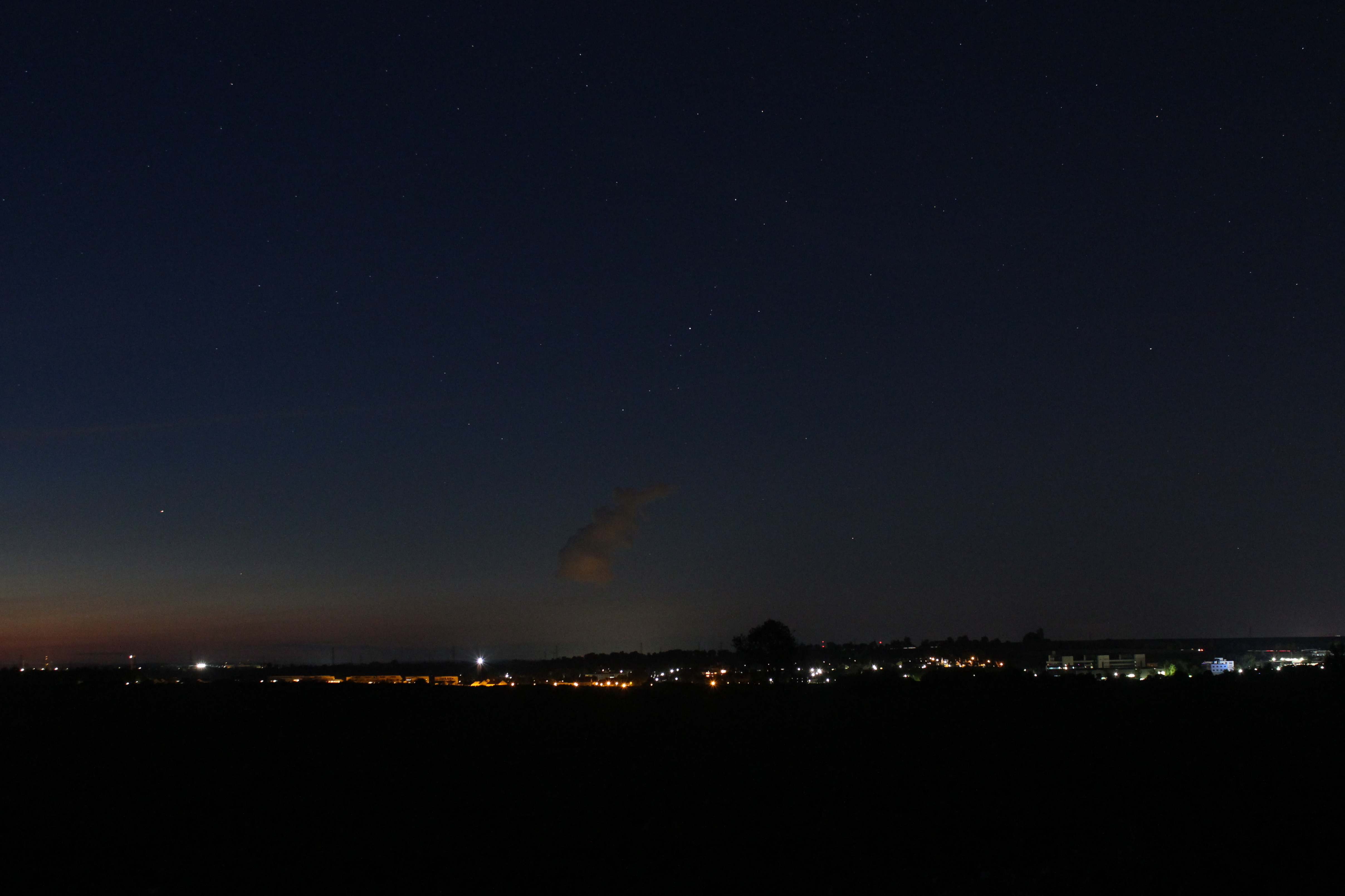 Perseus und Fuhrmann über dem Nordhorizont mit Münchingen im Vordergrund. Die Wolke wurde vom Kernkraftwerk Neckarwestheim erzeugt.