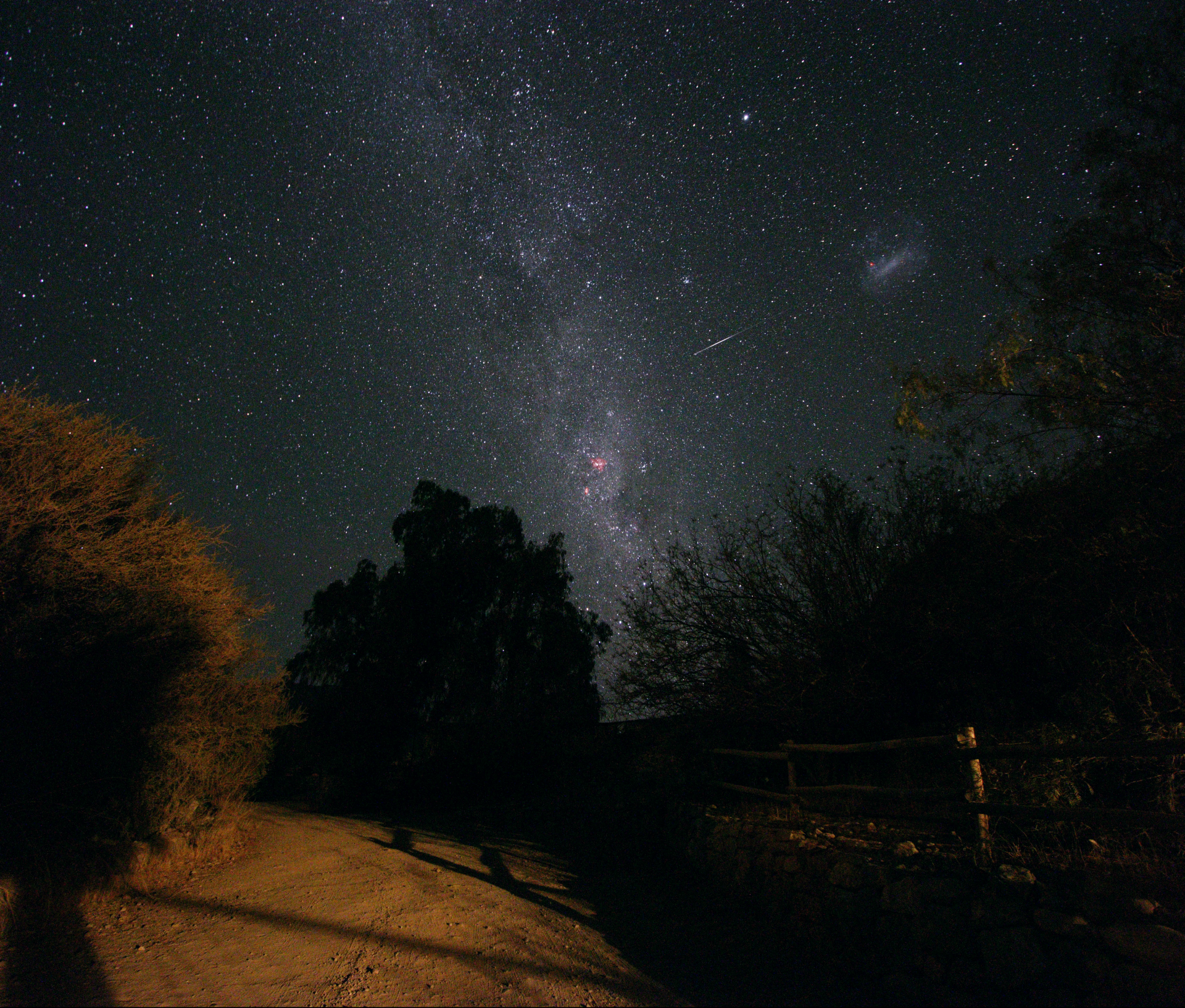 Blick Richtung Süden auf die Milchstraße. Im Bildzentrum liegt der Eta-Carina-Nebel im Band der Milchstraße, rechts darüber die Große Magellansche Wolke und dazwischen ein Meteor, der während der Aufnahme seine Spur am Himmel zog. Der zweithellste Stern des Nachthimmels, Canopus, ist im Bild oben, das Kreuz des Südens über den Bäumen unten zu erkennen.