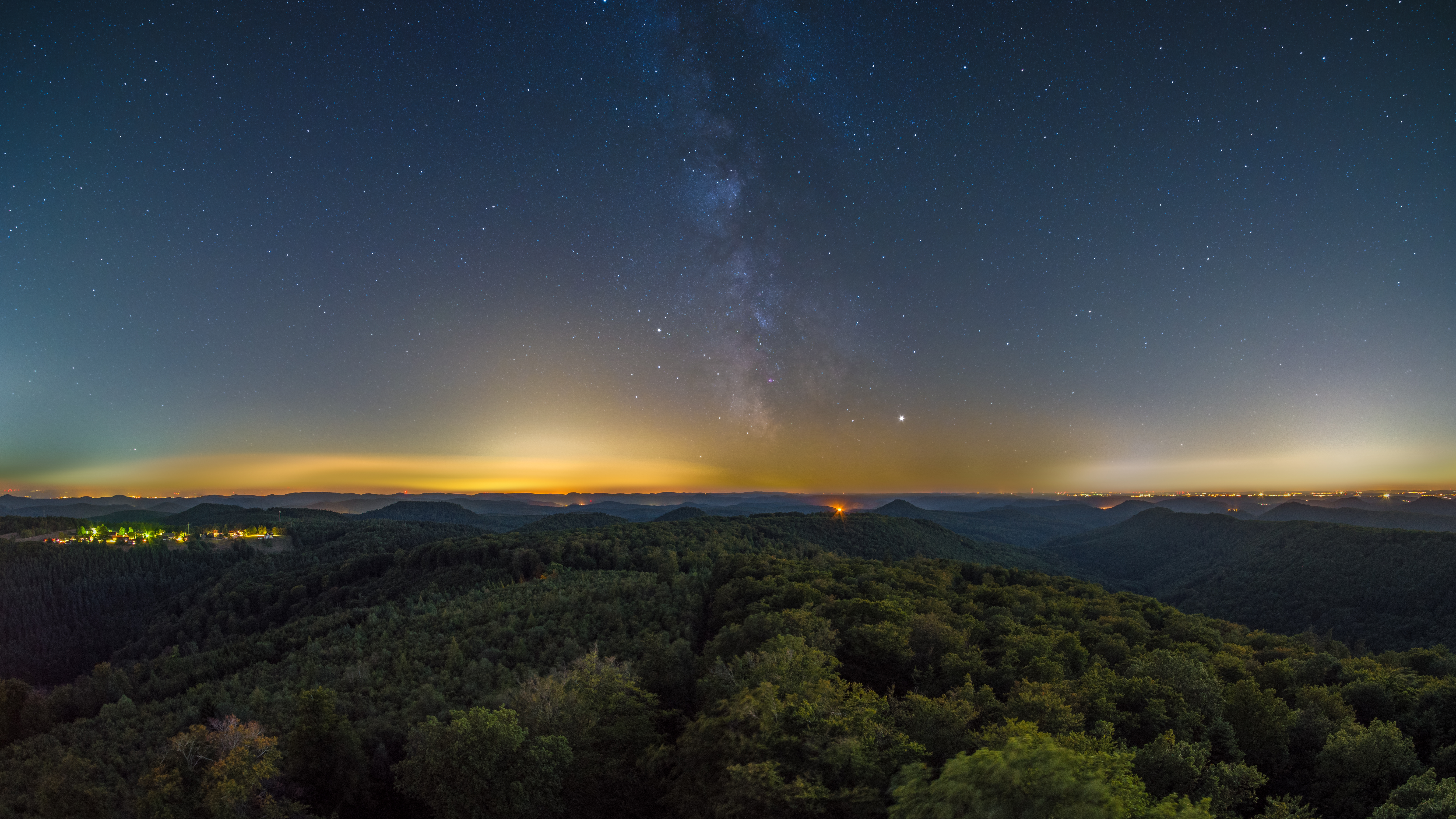 Der Luitpoldturm bei Merzalben ist einer der schönsten Aussichtspunkte im Pfälzerwald und jederzeit frei zugänglich. Von diesem Turm aus habe ich am 21. September 2019 das vorliegende Panorama bei Nacht aufgenommen, mit einem Fischaugen-Objektiv. Durch horizontale Ausrichtung der Kamera während der Aufnahme konnte ich erreichen, dass der Horizont nicht gekrümmt erscheint. Um sowohl die Landschaft als auch den Sternenhimmel möglichst detailliert abzubilden, habe ich bereits während der fortschreitenden Dämmerung zwischen 20:27 und 21:11 Uhr insgesamt 40 Aufnahmen von der Landschaft gemacht, mit f/4, 30s, ISO-1600; alle jeweils mit aktiver interner Dark-Subtraktion der Kamera, da der Sensor sicher noch nicht thermisch im Gleichgewicht war. Die Kamera war dabei ohne Bewegung fest auf dem Stativ. Ich habe alle Frames mit Störungen wie z.B. Autoscheinwerfer oder Taschenlampen von ankommenden Wanderern aussortiert. Es blieben 26 Frames übrig; die habe ich mit DeepSkyStacker ohne Ausrichtung gestackt, und zwar durch arithmetische Mittelung. Das Resultat habe ich mit Lightroom 6 bearbeitet. Den Sternenhimmel habe ich zwischen 21:20 und 21:56 Uhr 60 x 30s belichtet mit f/4, ISO-1600, diesmal mit Nachführung und ohne interne Dark-Subtraktion. Am Ende habe ich noch 20 Dark Frames aufgenommen. Das Resultat habe ich mit DeepSkyStacker gestackt mit automatischer Ausrichtung und dem Median-Verfahren. Das Resultat habe ich erneut mit Lightroom 6 bearbeitet. Am Ende habe ich mit Gimp die zwei Bilder montiert durch Ausrichtung und Überlagerung zweier Ebenen und Definition transparenter Bereiche auf der oberen Ebene, dem Sternenhimmel.